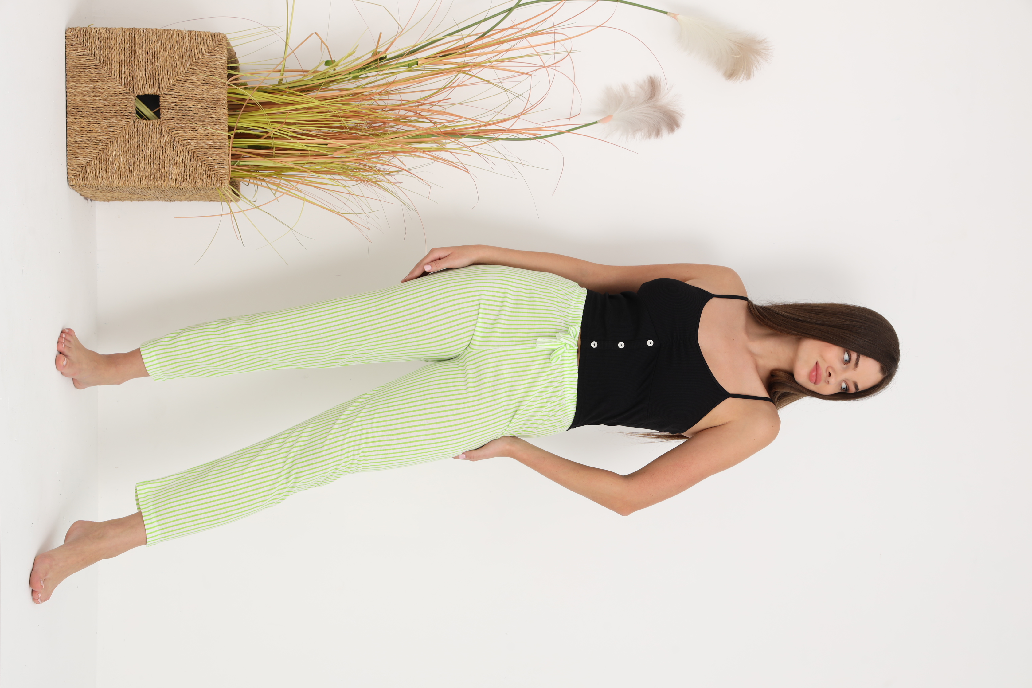 Pantaloni lungi de pijama pentru damă, confecționați dintr-un material plăcut la atingere, cu compoziție 50% bumbac și 50% poliester. Țesătura asigură confort și respirabilitate, iar în același timp rezistență și întreținere ușoară.