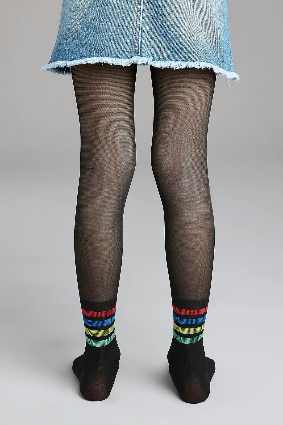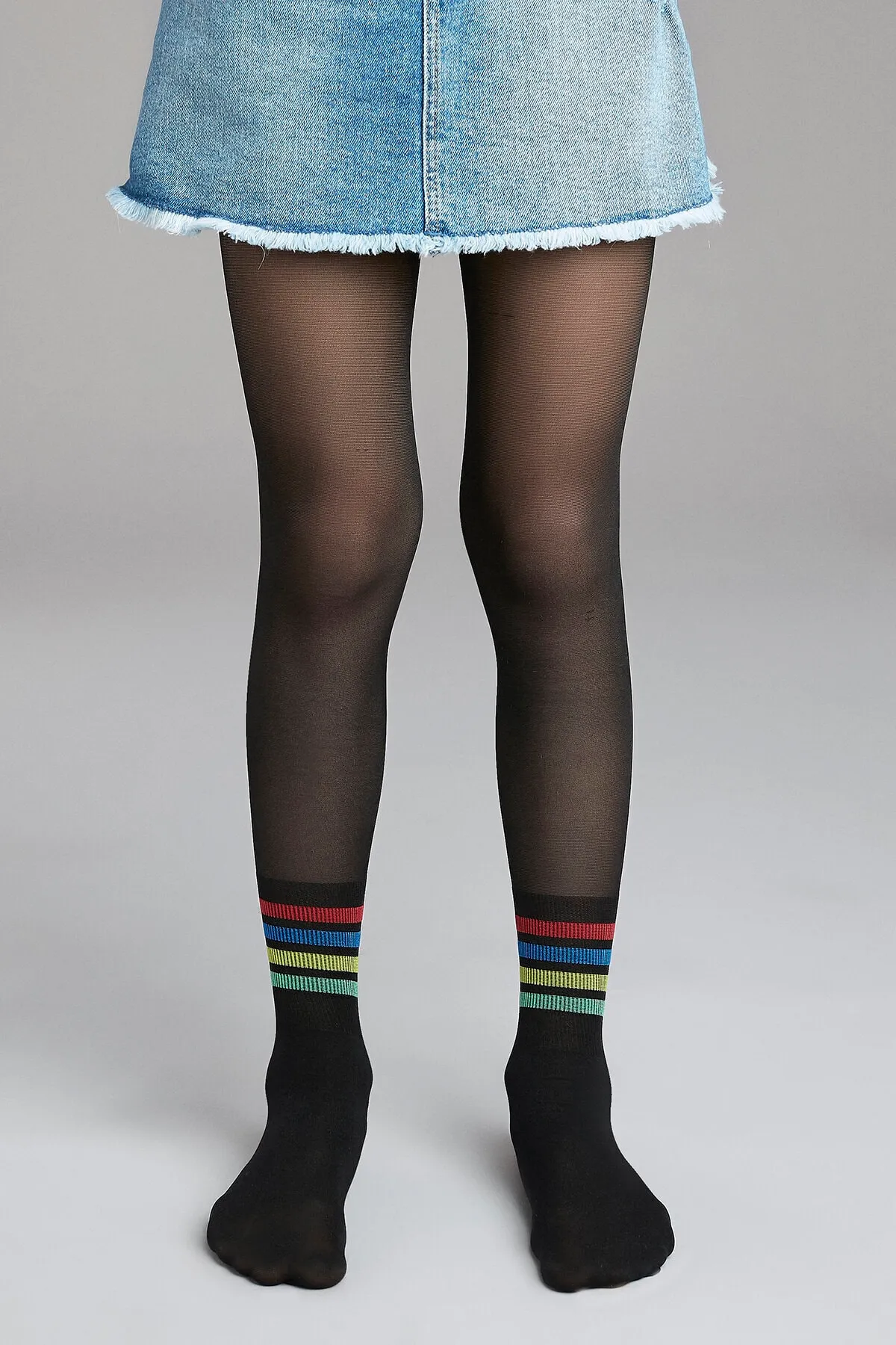 Dresul Penti Rainbow Stripe 30 DEN pentru fete, în culoarea neagră, aduce un aer jucăuș și plin de culoare prin imprimeul său cu dungi multicolore. Ideal pentru fetițele care iubesc ținutele vesele și originale, acest dres combină confortul cu stilul unic.