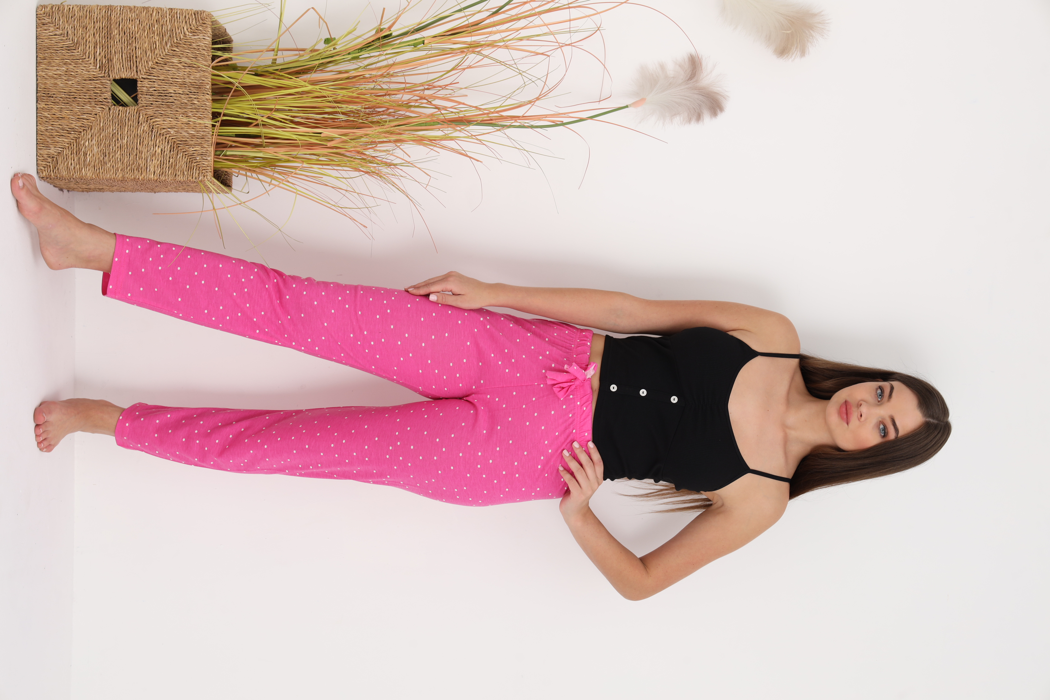 Pantaloni lungi de pijama pentru damă, confecționați dintr-un material plăcut la atingere, cu compoziție 50% bumbac și 50% poliester. Țesătura asigură confort și respirabilitate, iar în același timp rezistență și întreținere ușoară.