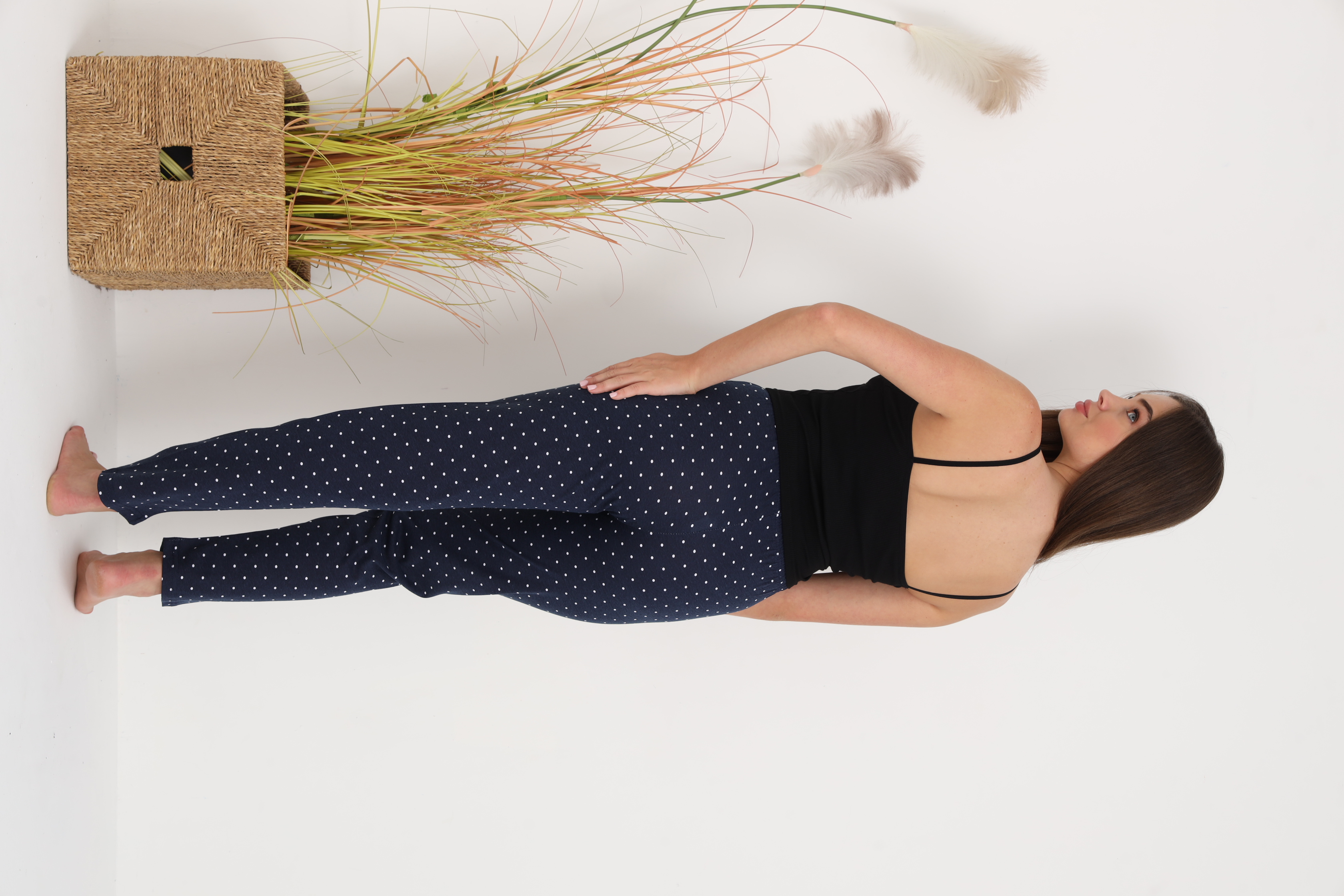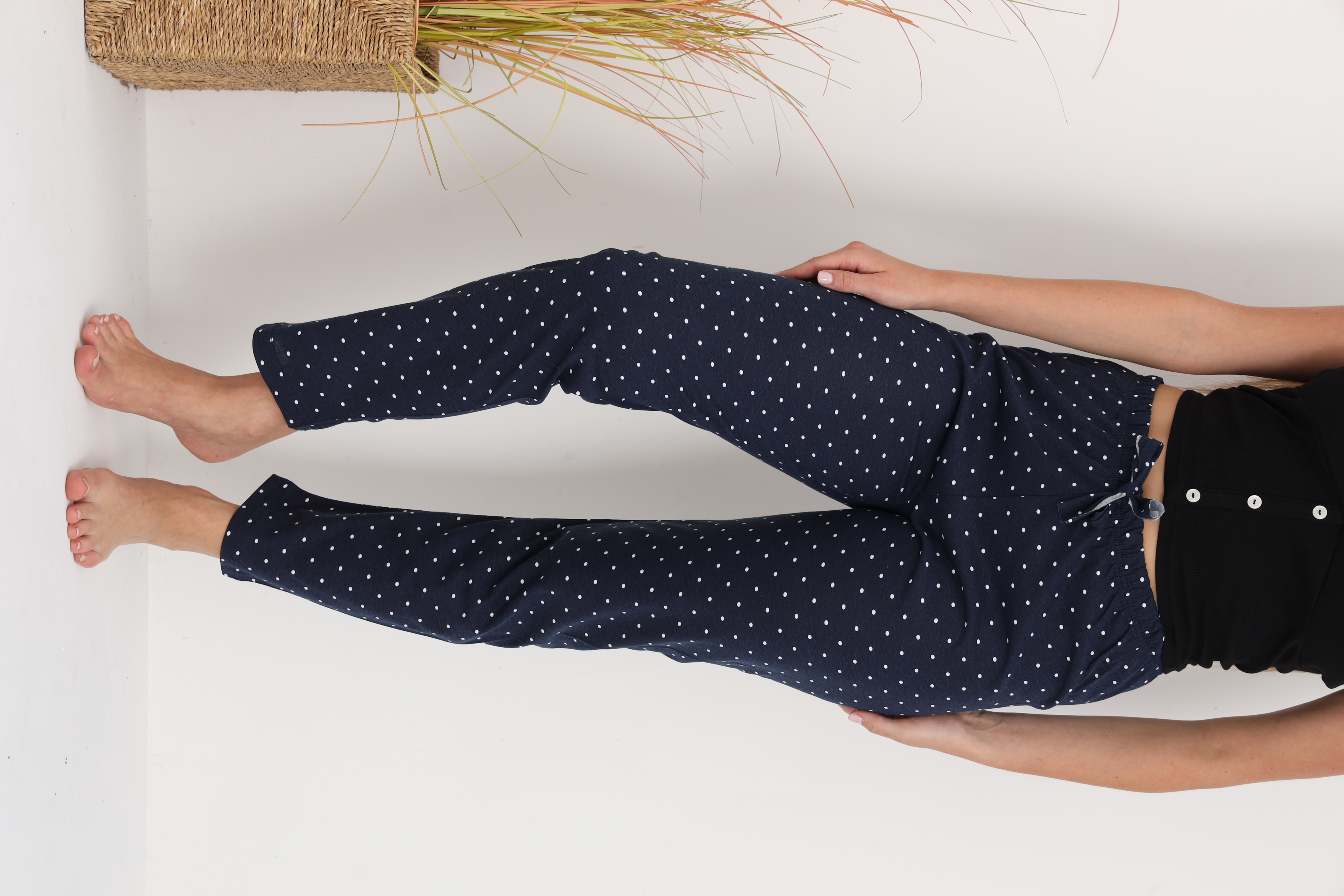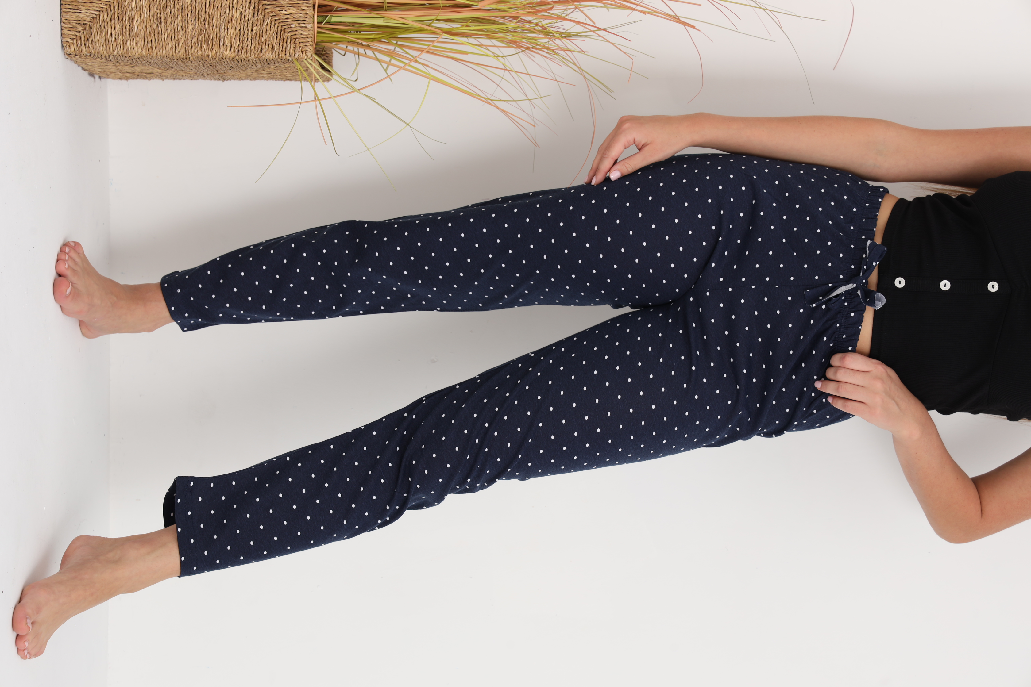 Pantaloni lungi de pijama pentru damă, confecționați dintr-un material plăcut la atingere, cu compoziție 50% bumbac și 50% poliester. Țesătura asigură confort și respirabilitate, iar în același timp rezistență și întreținere ușoară.