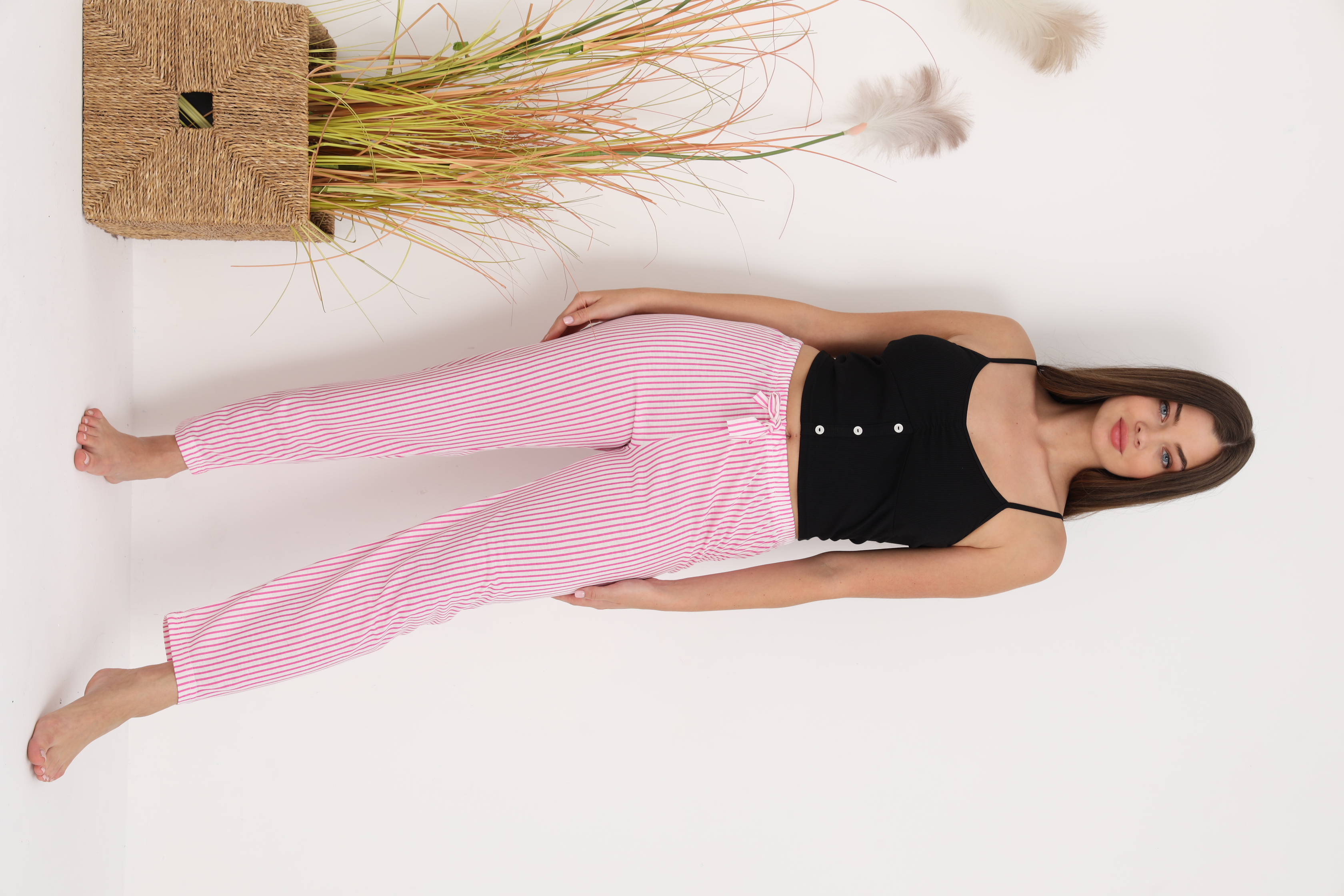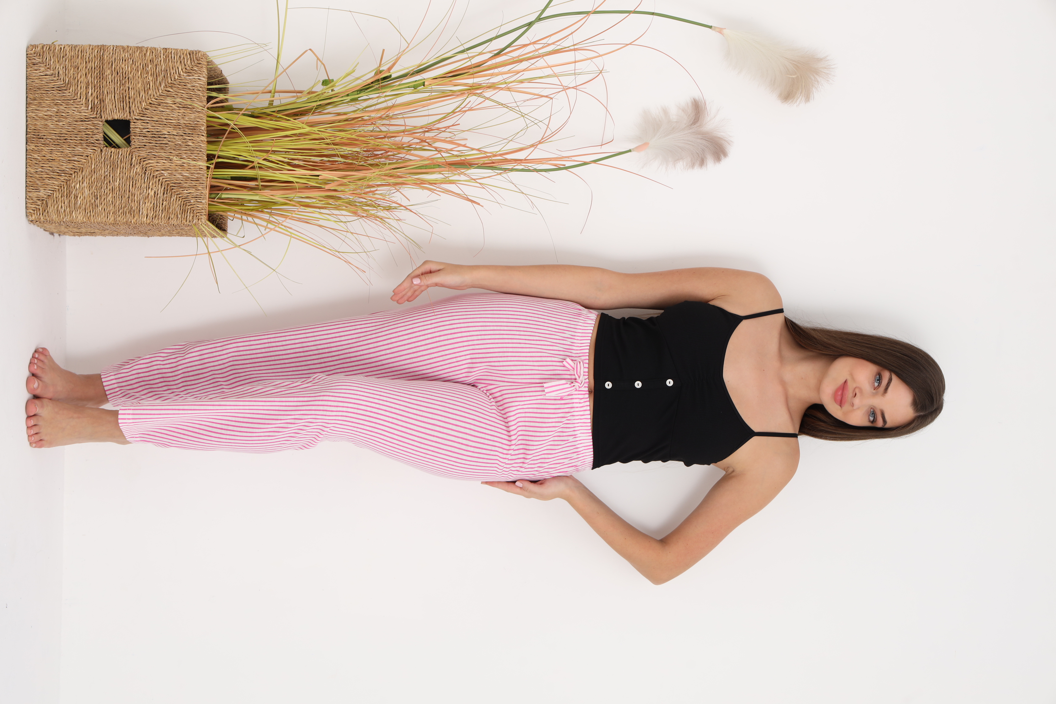 Pantaloni lungi de pijama pentru damă, confecționați dintr-un material plăcut la atingere, cu compoziție 50% bumbac și 50% poliester. Țesătura asigură confort și respirabilitate, iar în același timp rezistență și întreținere ușoară.