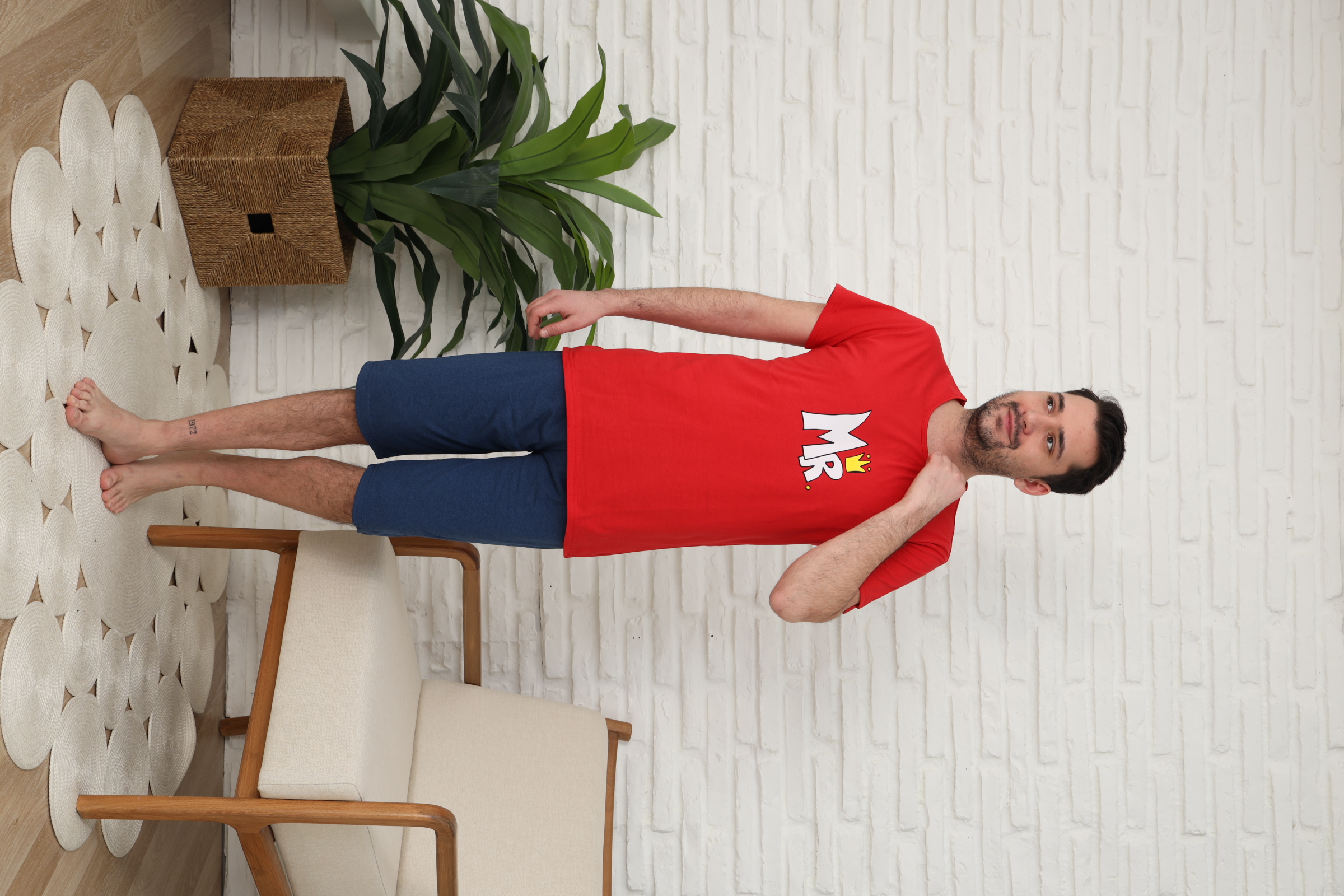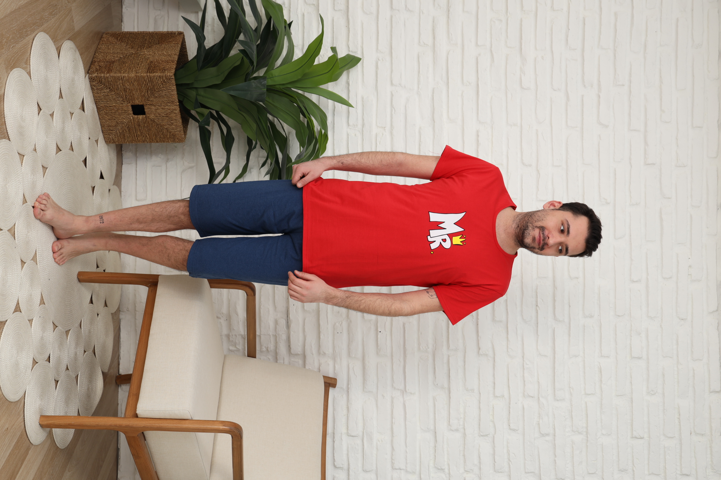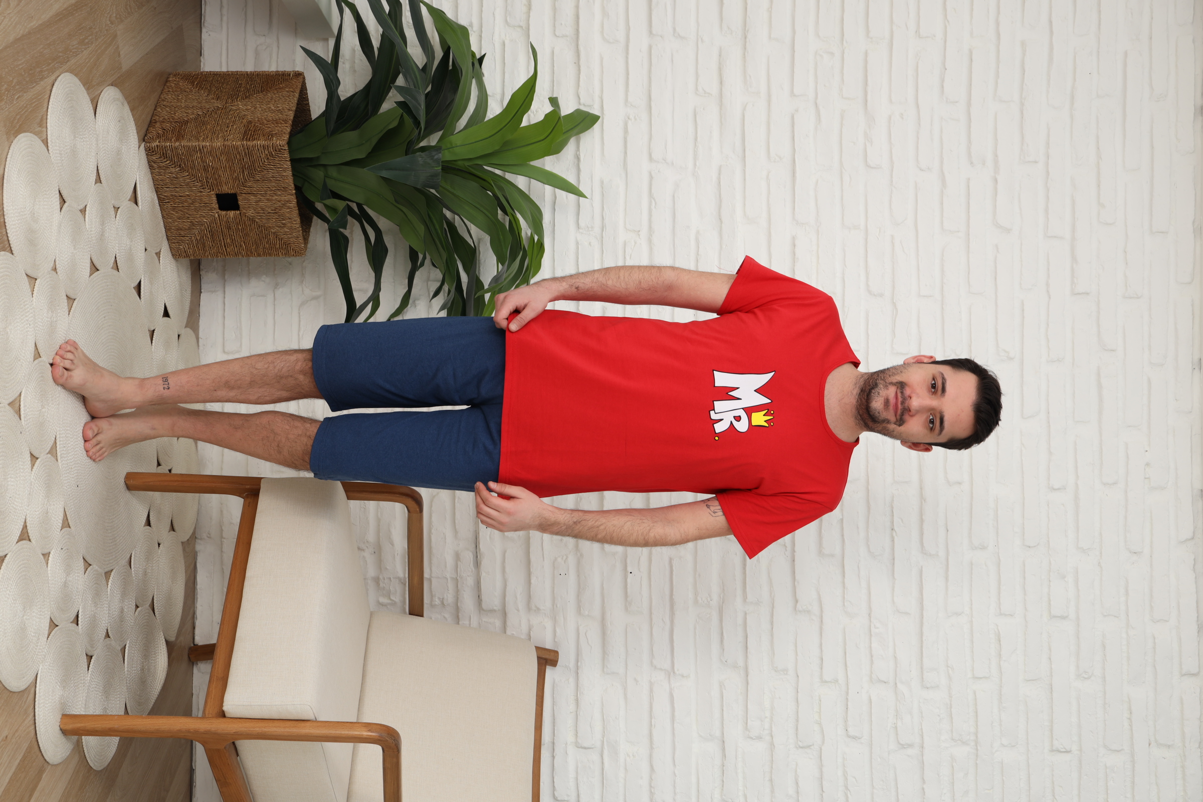 Această pijama bărbătească oferă combinația perfectă de confort și stil. Tricoul roșu cu un design modern se asortează perfect cu pantalonii trei sferturi de culoare bleumarin, care au un print distinctiv ce completează ansamblul.