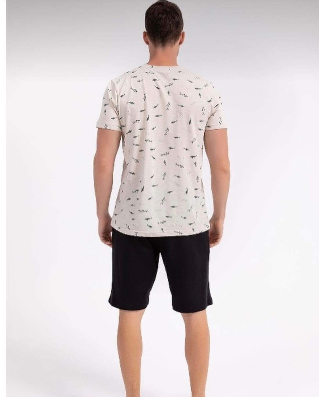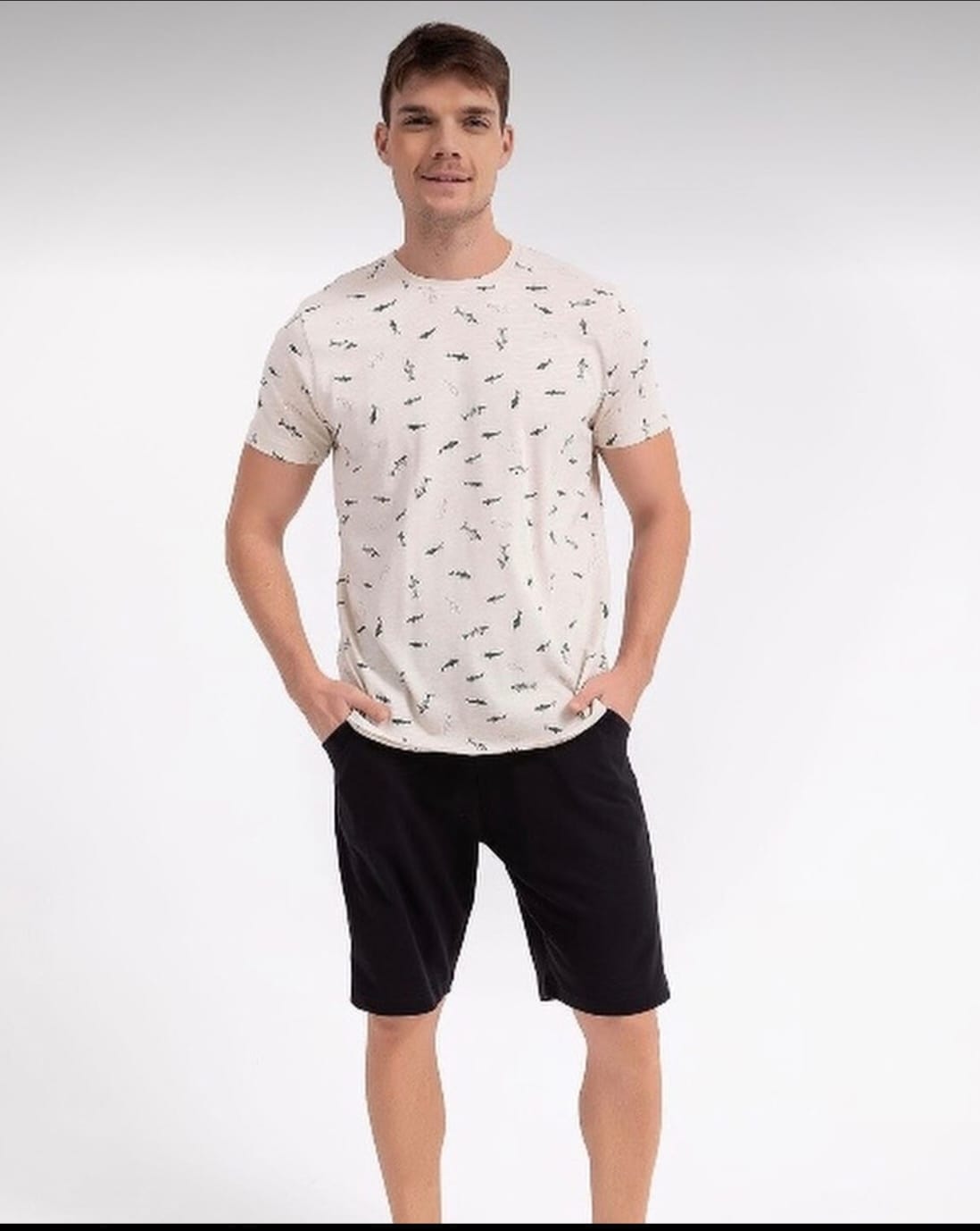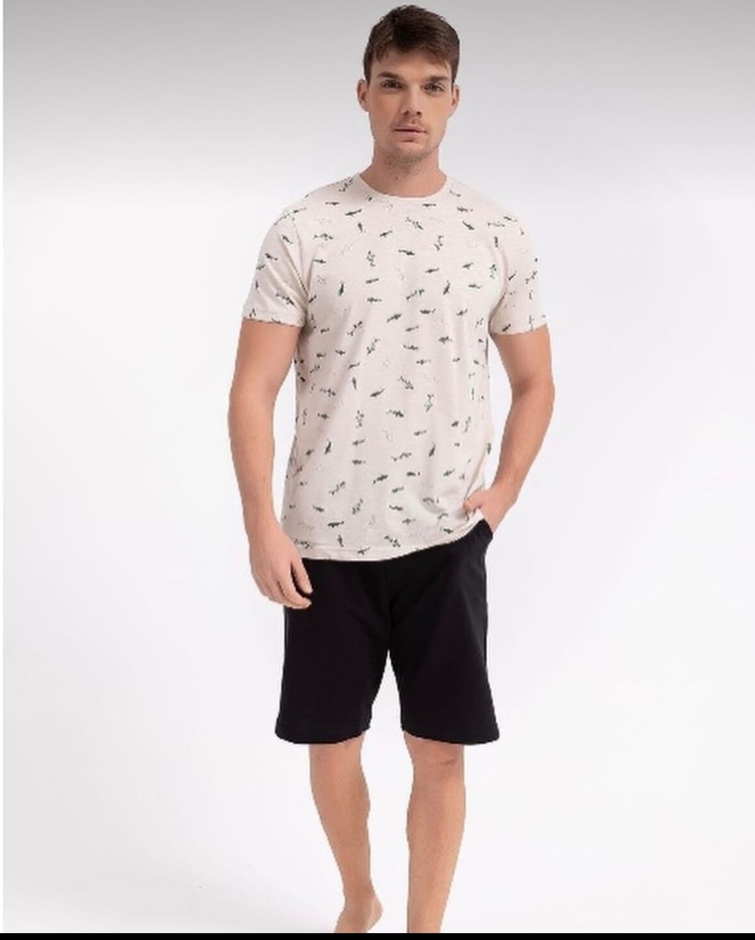Pijama bărbați este alegerea perfectă pentru nopțile de vară sau serile relaxante acasă. Setul include o bluză cu mânecă scurtă și pantaloni scurți, amândouă decorate cu un imprimeu cu rechin, aducând un aer jucăuș și modern. Fabricată din materiale ușoare și respirabile, această pijama asigură un confort optim și libertate de mișcare pe toată durata nopții.