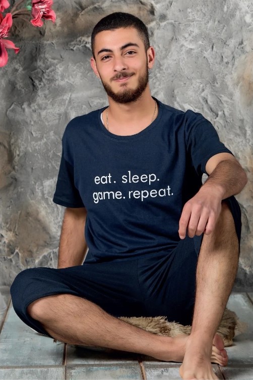 Pijamă bărbați cu mâneca scurtă și pantaloni trei sferturi bleumarin, realizată dintr-un amestec de 50% bumbac și 50% poliester, perfectă pentru zilele călduroase de vară. Design confortabil și respirabil, ideală pentru relaxare acasă.