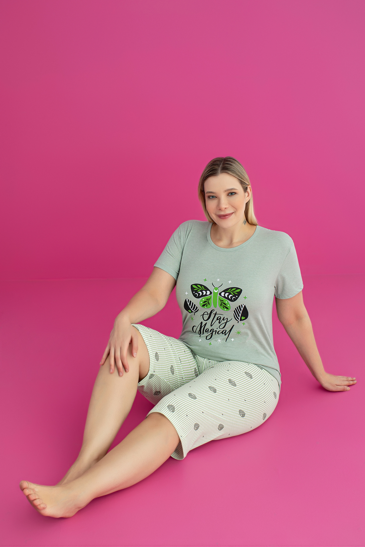 Pijama damă mărimi mari, perfectă pentru nopți confortabile și momente de relaxare acasă. Bluza are mâneci scurte și este decorată cu un imprimeu delicat cu fluture, într-o nuanță plăcută de verde deschis. Mesajul „Stay Magical” adaugă un plus de farmec și pozitivitate.