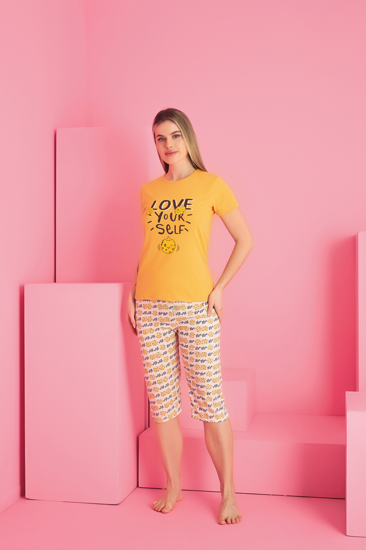 Pijama confortabilă și veselă, realizată din bumbac 100%, perfectă pentru nopți relaxante și momente de răsfăț acasă. Setul include o bluză cu mânecă scurtă și pantaloni 3/4 cu talie elastică, oferind libertate de mișcare și senzație plăcută pe tot parcursul nopții.