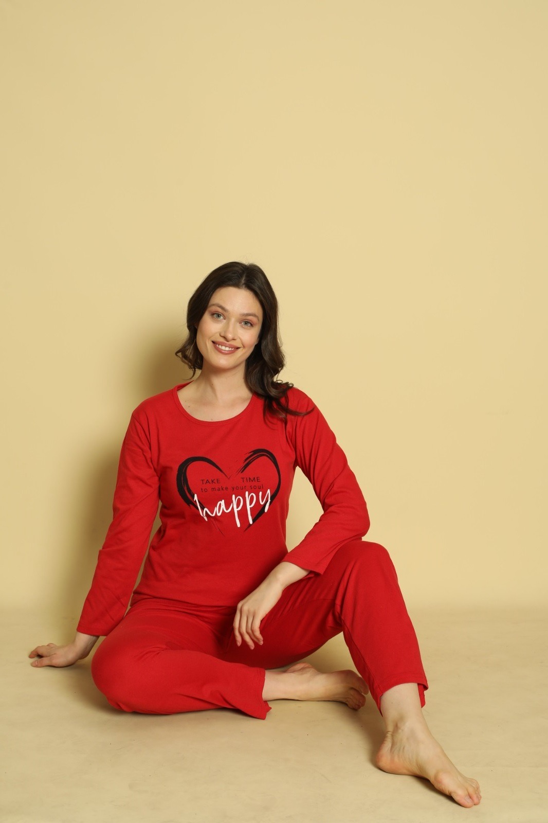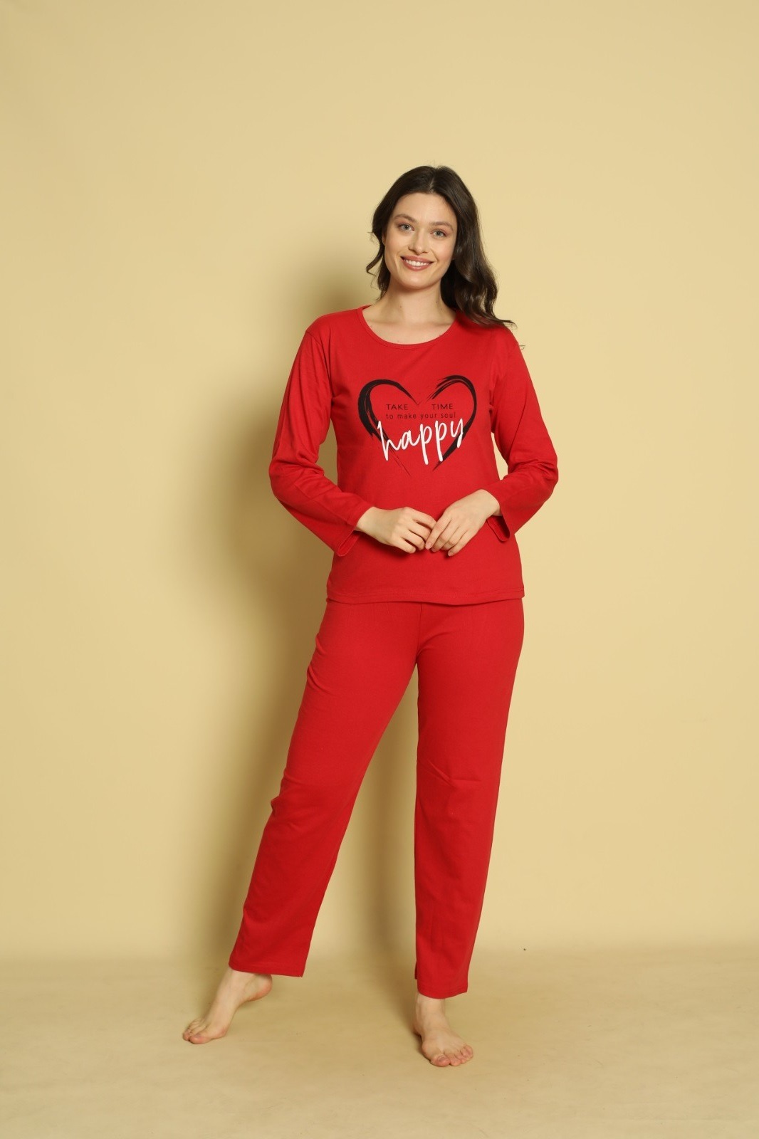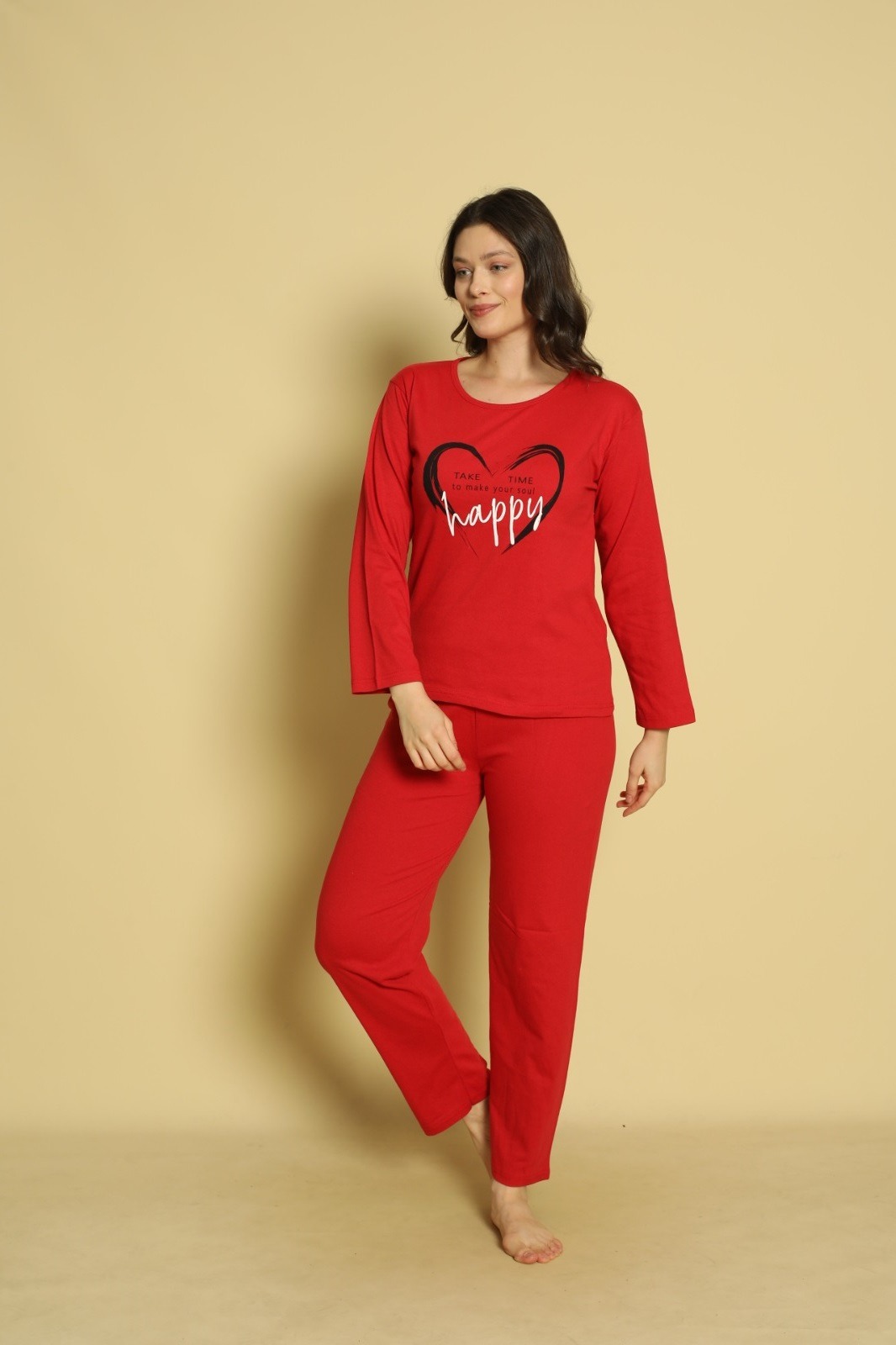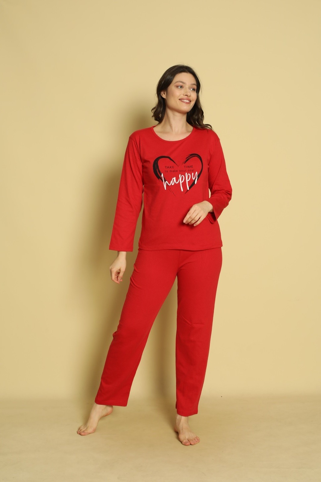 Încălzește-ți serile cu pijama dama maneca lunga și pantaloni lungi Happy, creată pentru confortul tău absolut. Confectionată dintr-un amestec plăcut de materiale, aceasta combină confortul cu un design vesel, perfect pentru momentele tale de relaxare. Croiala lejeră permite mișcarea liberă, iar materialul respirabil și ușor de întreținut îți garantează un somn odihnitor și o senzație de prospețime. Ideală pentru nopțile răcoroase, această pijama adaugă o notă pozitivă și confortabilă garderobei tale.