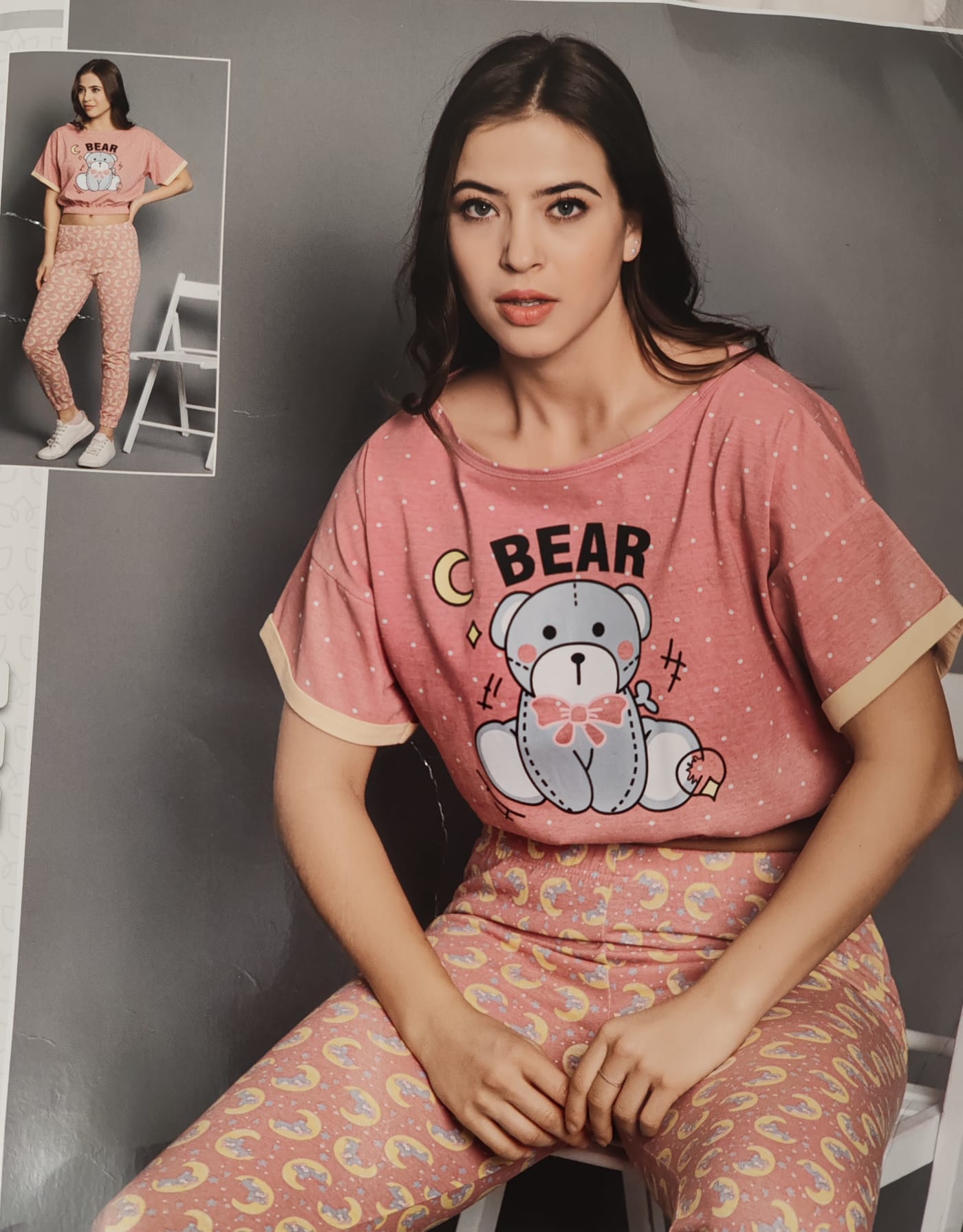 Pijama damă cu mânecă scurtă și pantaloni lungi, decorată cu un imprimeu drăguț cu ursuleț. Realizată pentru confort și relaxare, această pijama combină libertatea oferită de mânecile scurte cu protecția pantalonilor lungi, fiind perfectă pentru serile răcoroase sau nopțile confortabile acasă. Materialul moale și croiala lejeră asigură o senzație plăcută pe piele și libertate de mișcare.