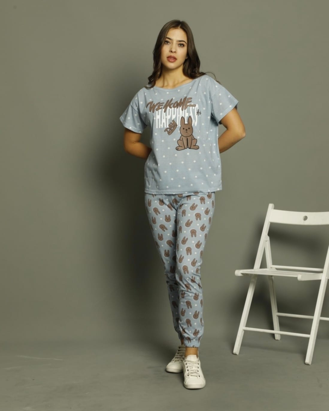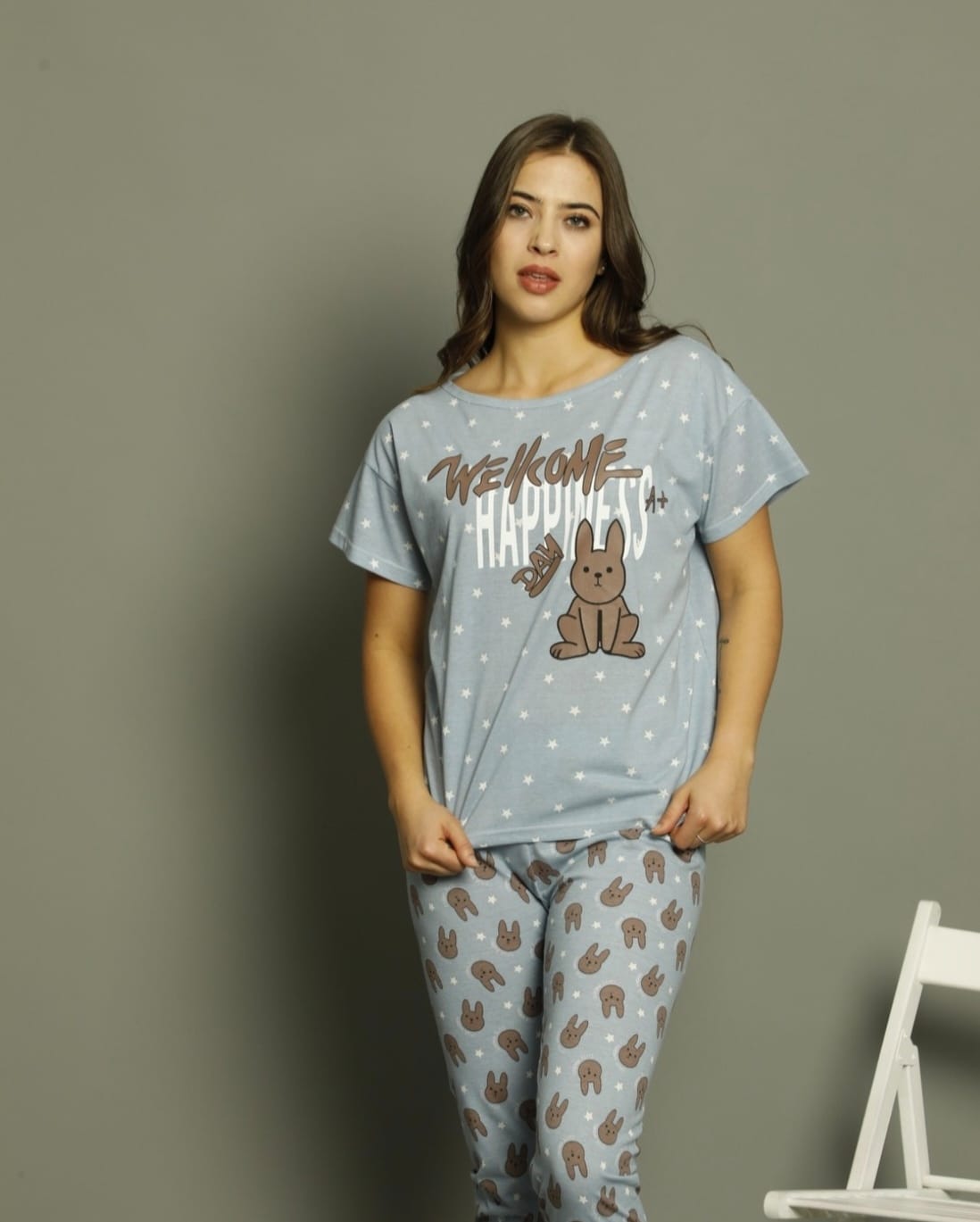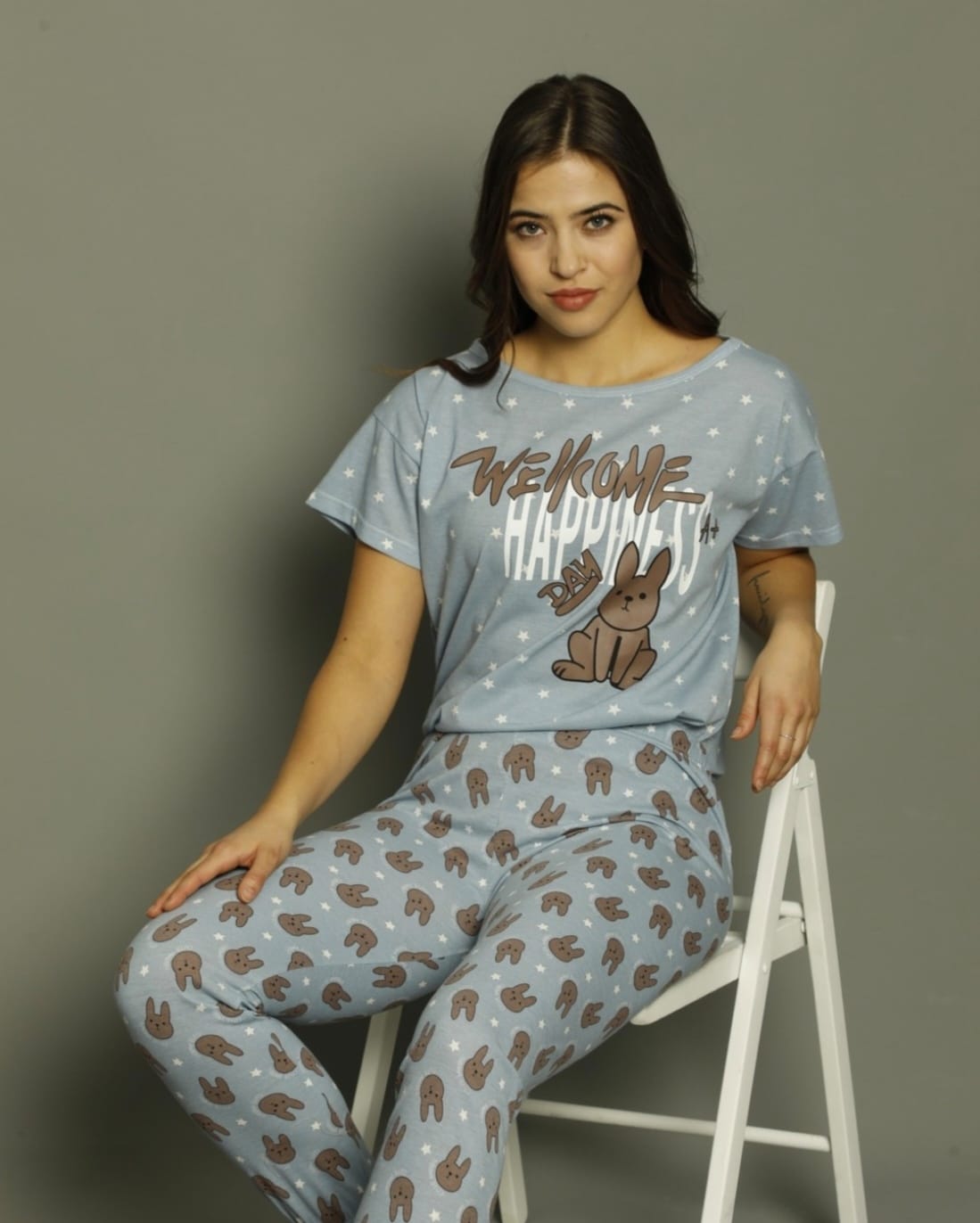 Împodobește-ți nopțile cu un set adorabil de pijama damă „Ieupurași”! Acest set include un tricou cu mânecă scurtă și pantaloni lungi, amândouă decorate cu un imprimeu drăgălaș cu iepurași. Confecționată din bumbac 100%, pijama îți oferă confort și un look vesel, perfect pentru serile răcoroase sau momentele de relaxare acasă. Ideală pentru iubitoarele de animale și un cadou minunat! 🐰💕