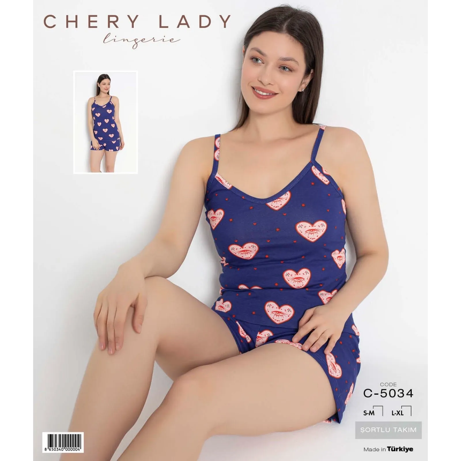 Pijama de damă din bumbac, ideală pentru sezonul cald, care îți oferă confort și un look jucăuș. Setul include un maiou cu bretele reglabile și un short cu talie elastică, ambele decorate cu un design vesel cu inimoare. Fabricată din bumbac de înaltă calitate, pijama este moale, ușor de purtat și permite pielii să respire, asigurând un somn odihnitor. Disponibilă într-o gamă variată de mărimi, este perfectă pentru momentele de relaxare acasă sau pentru un cadou inspirat