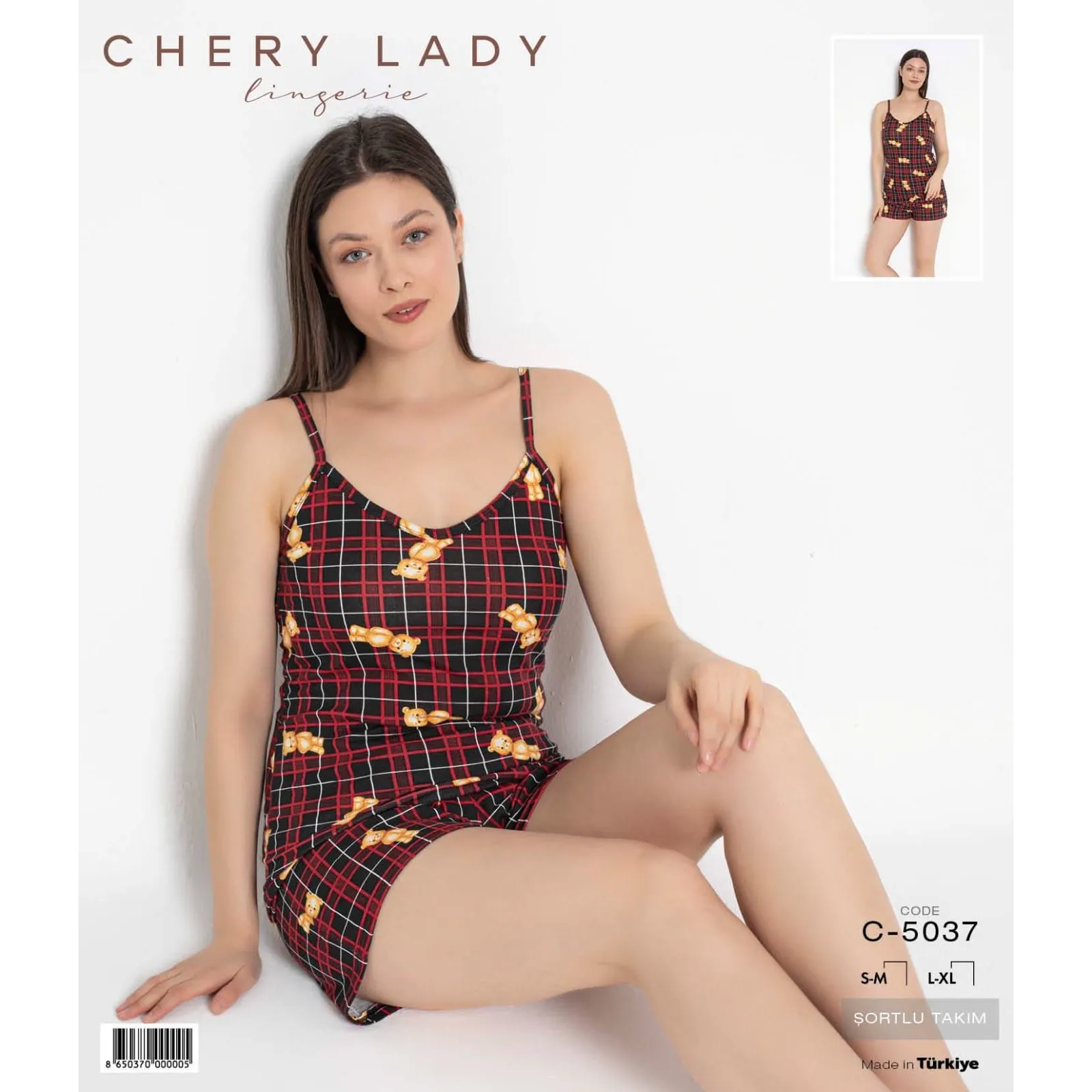 Pijama de damă din bumbac cu maiou și șort, design ursuleț, este alegerea perfectă pentru un look confortabil și adorabil. Confecționată din bumbac moale și respirabil, această pijama îți oferă o senzație plăcută pe piele și un somn odihnitor. Designul drăgălaș cu ursuleți adaugă un aer jucăuș și cald, fiind ideală pentru nopțile de vară sau momentele de relaxare acasă. Perfectă pentru a te răsfăța într-un stil confortabil și vesel!