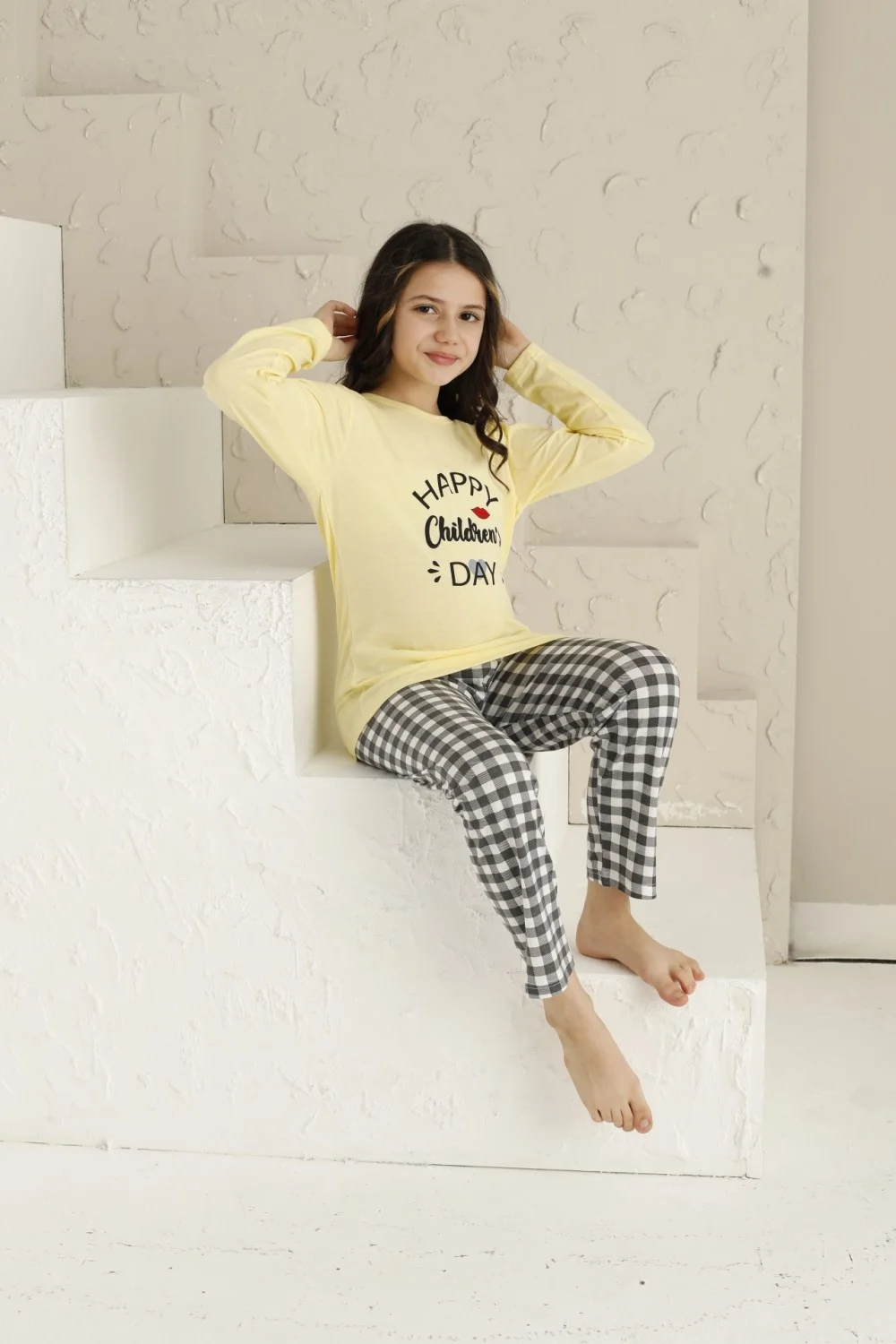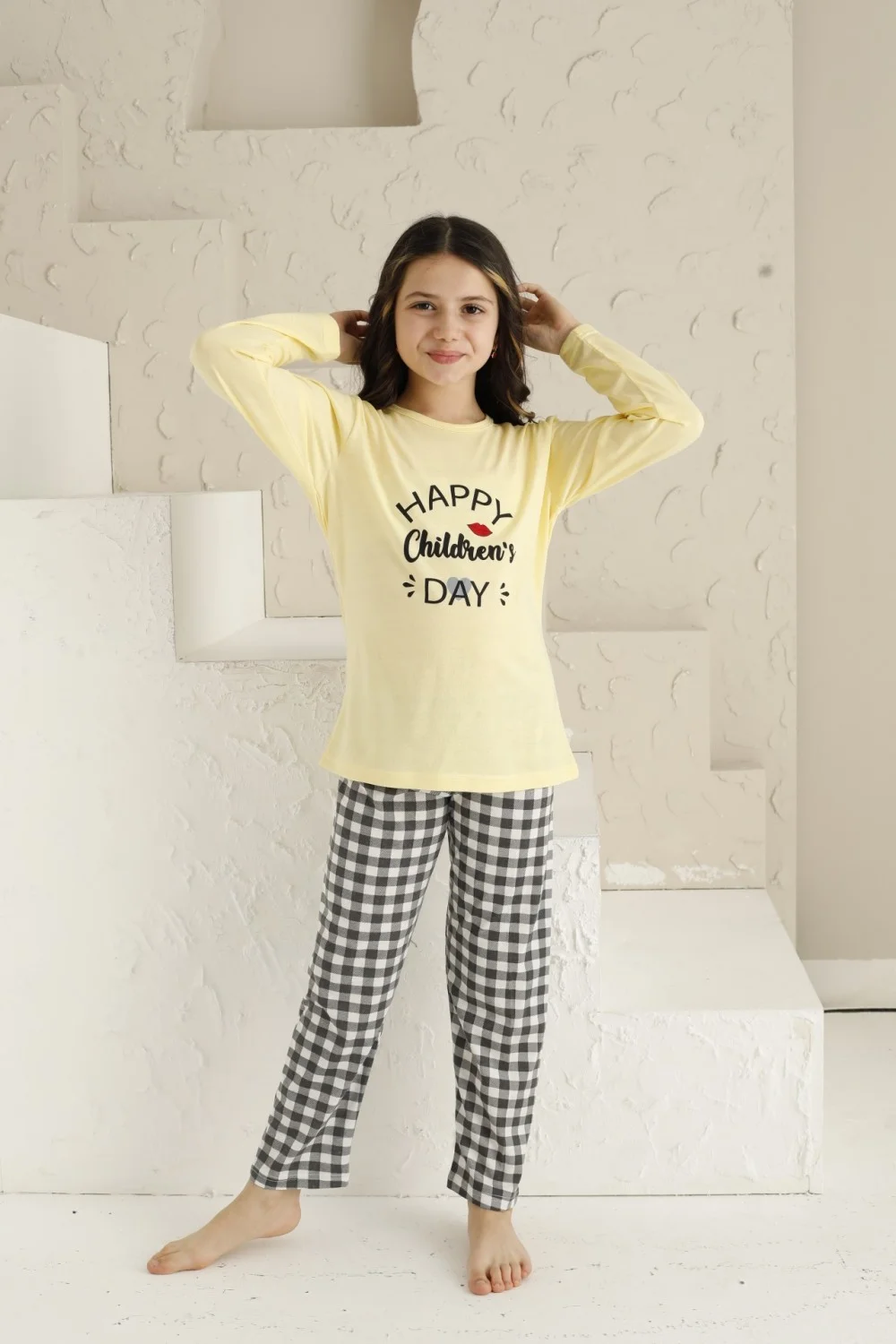 Îmbogățește nopțile fetiței tale cu această pijama galbenă veselă și confortabilă! Cu mânecă lungă și pantaloni lungi, oferă protecție și căldură în timpul nopților răcoroase. Imprimeul „Happy Day” adaugă un strop de energie și bucurie, perfect pentru fetițele care iubesc culorile vesele și un somn confortabil.