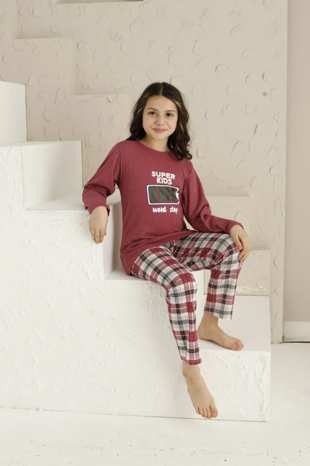 Această pijama roz închis pentru fete cu mânecă lungă și pantaloni lungi este perfectă pentru nopțile răcoroase. Designul „Super Kids” adaugă un strop de distracție și originalitate, fiind ideală pentru fetițele care iubesc să se simtă confortabil și stilate în același timp. Materialul moale și plăcut pe piele va asigura un somn odihnitor și plin de energie.