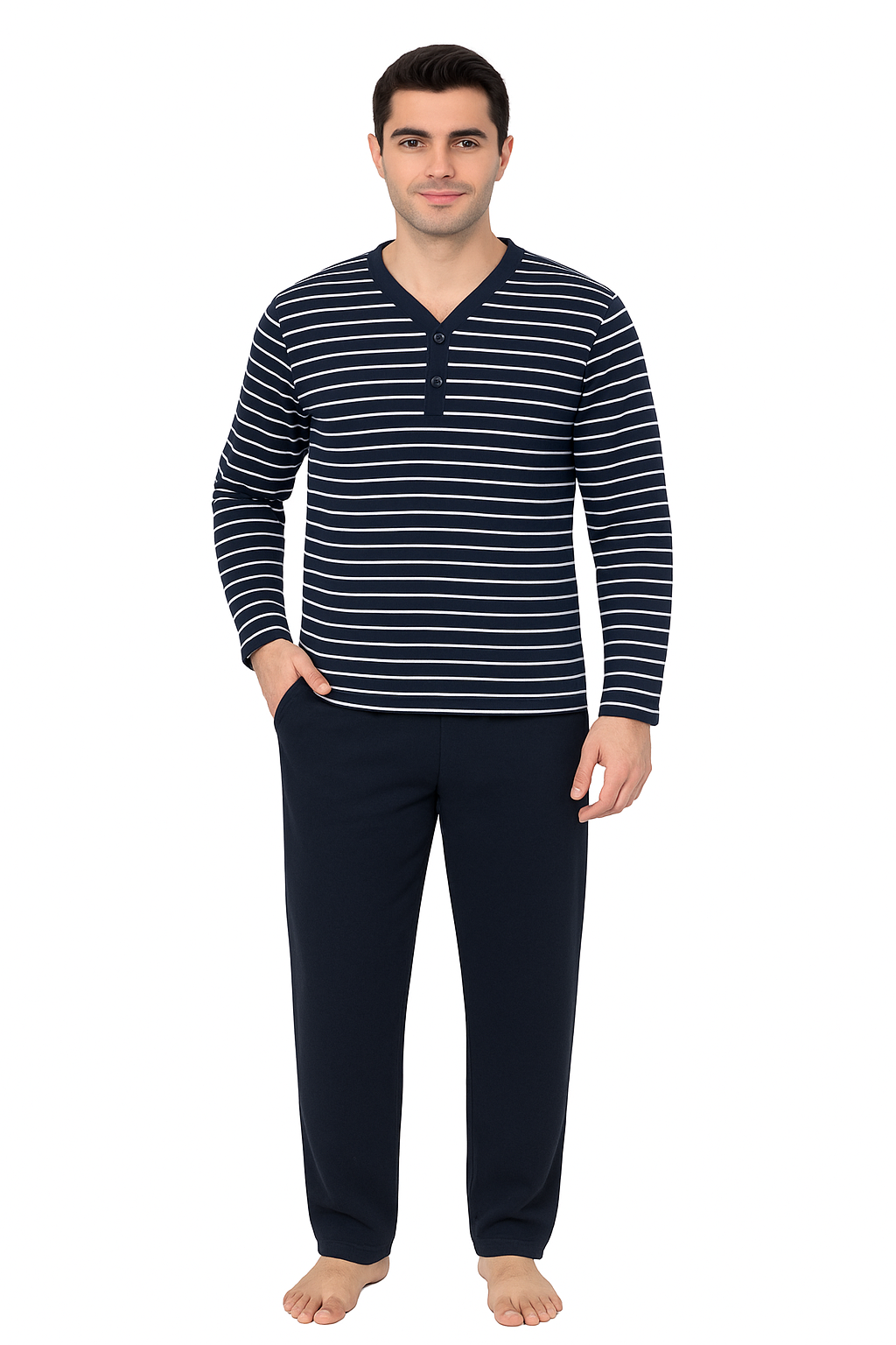 Pijamaua pentru bărbați este compusă dintr-o bluză cu 3 nasturi, realizată din material ușor vătuit pentru un plus de confort și căldură, având un design cu dungi orizontale navy și albe. Bluza are croială lejeră și decolteu în V, fiind practică și plăcută la purtat. Pantalonii sunt confecționați din bumbac nevătuit, de culoare navy, cu croială dreaptă și talie elastică, asigurând libertate de mișcare și confort pe durata nopții.