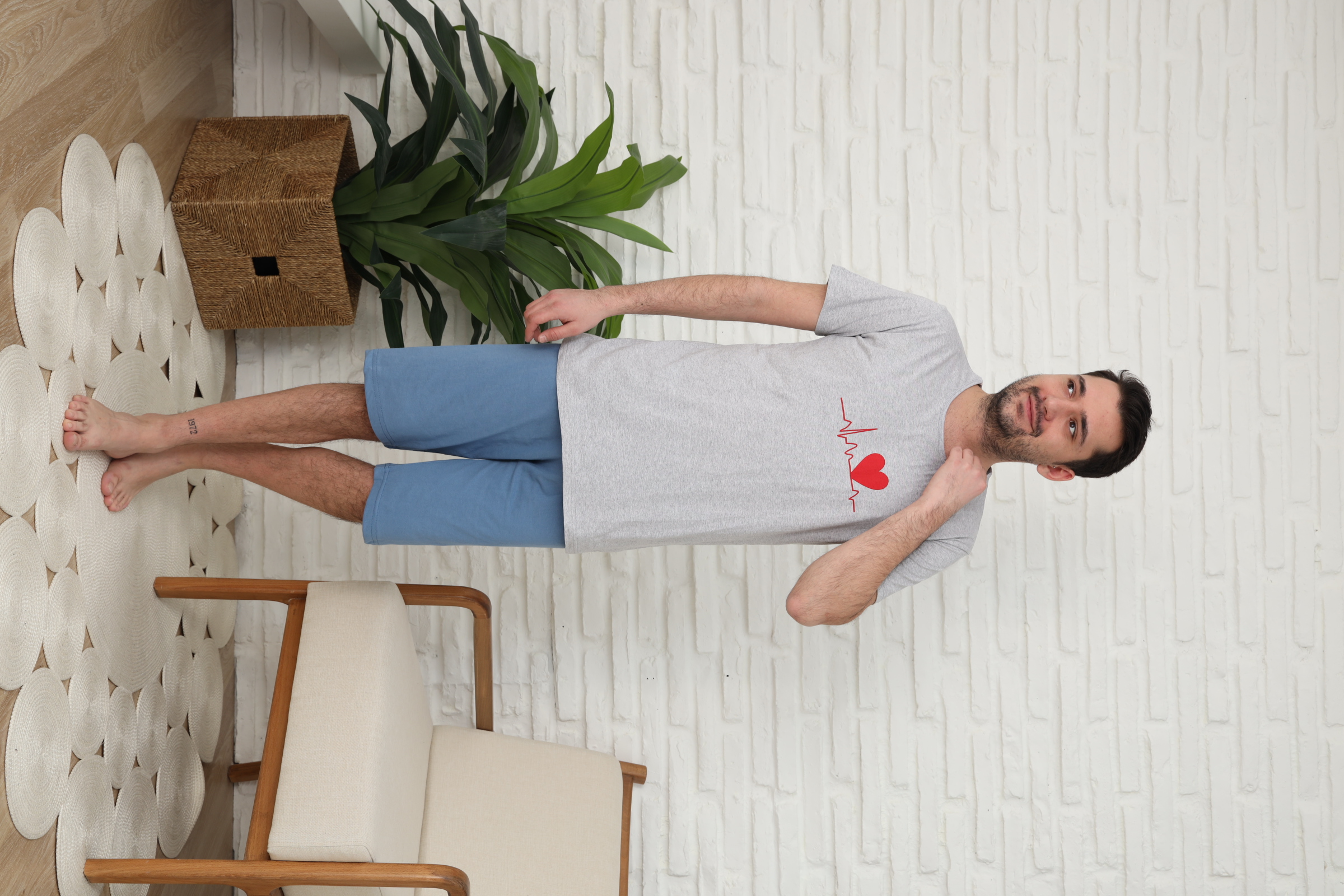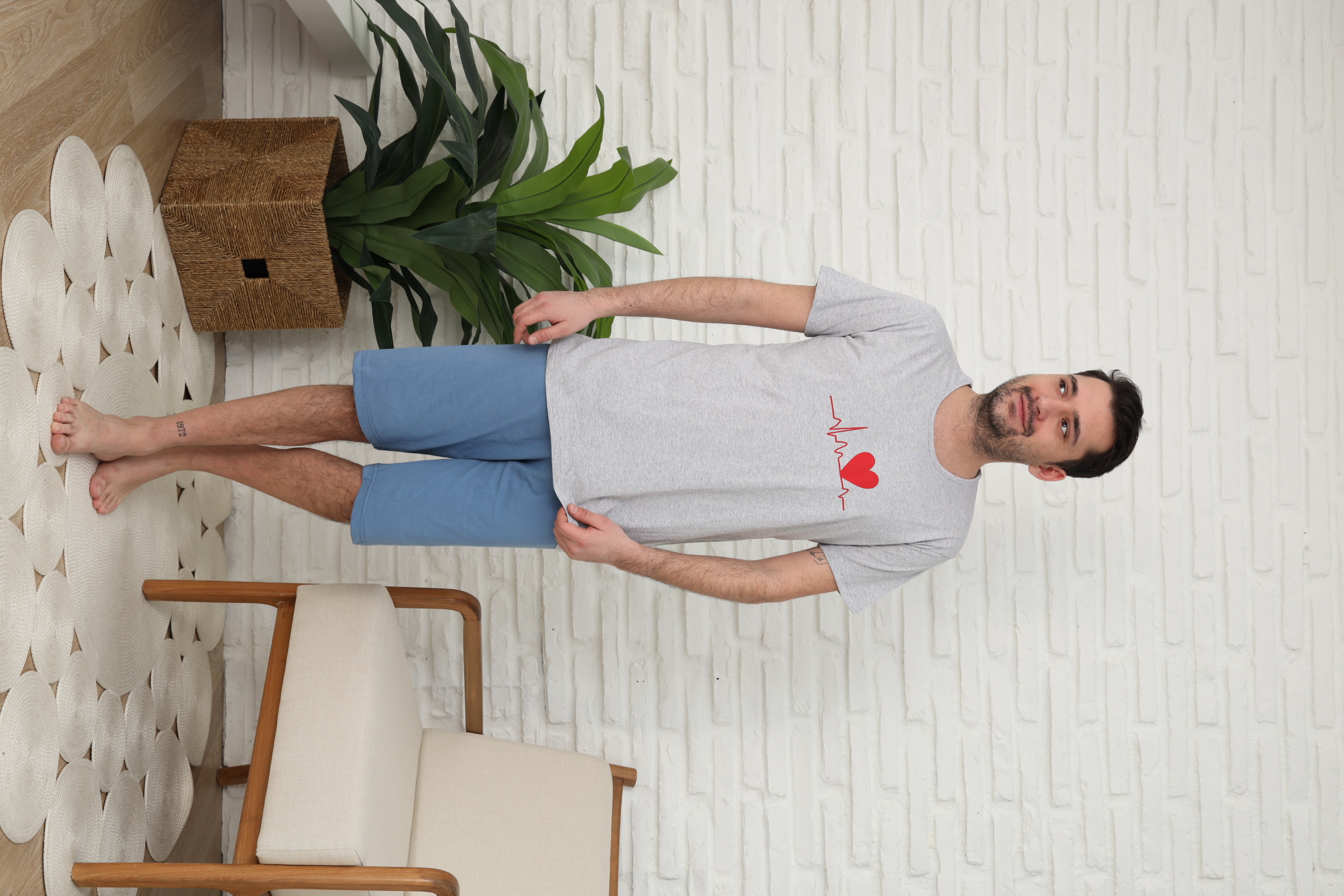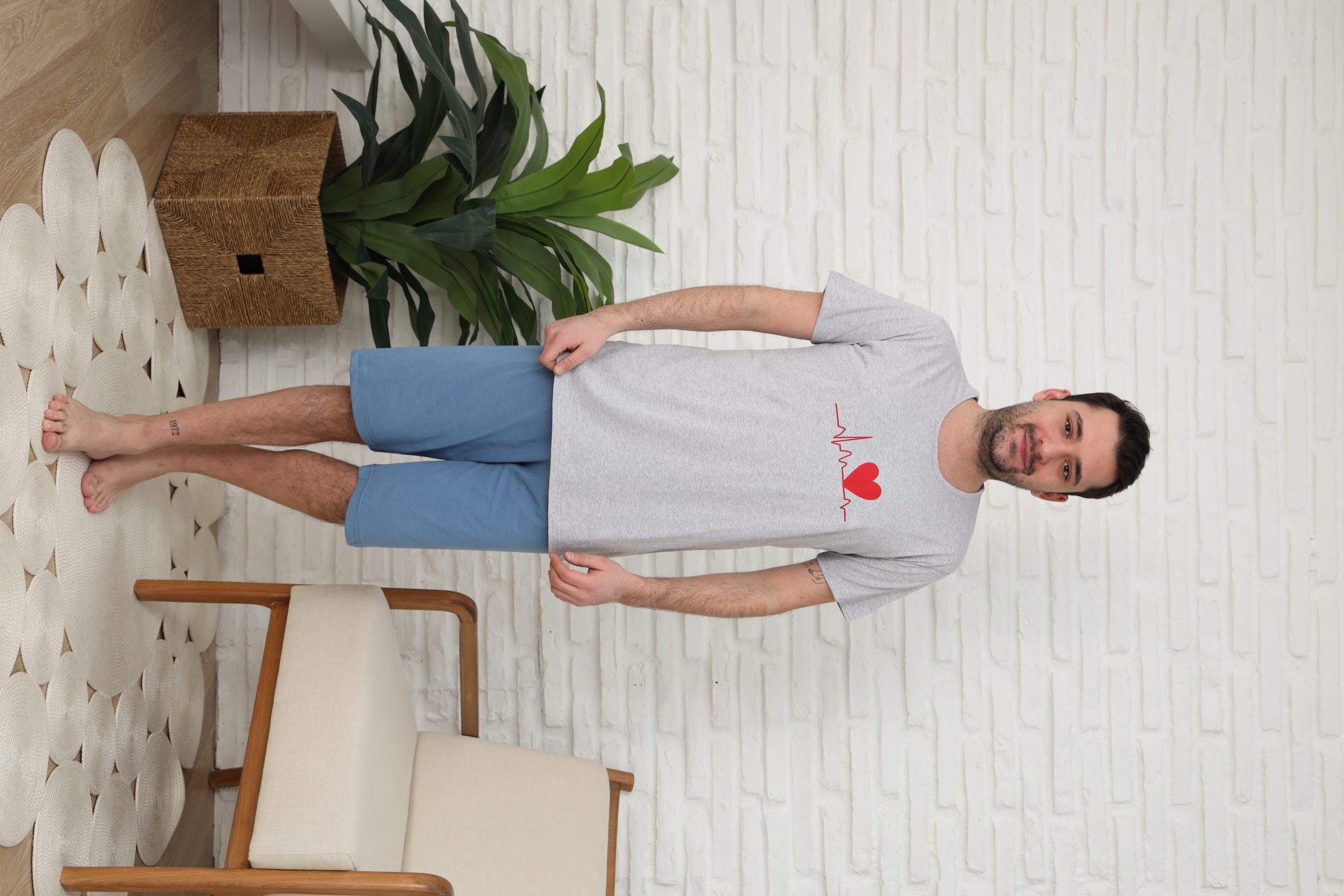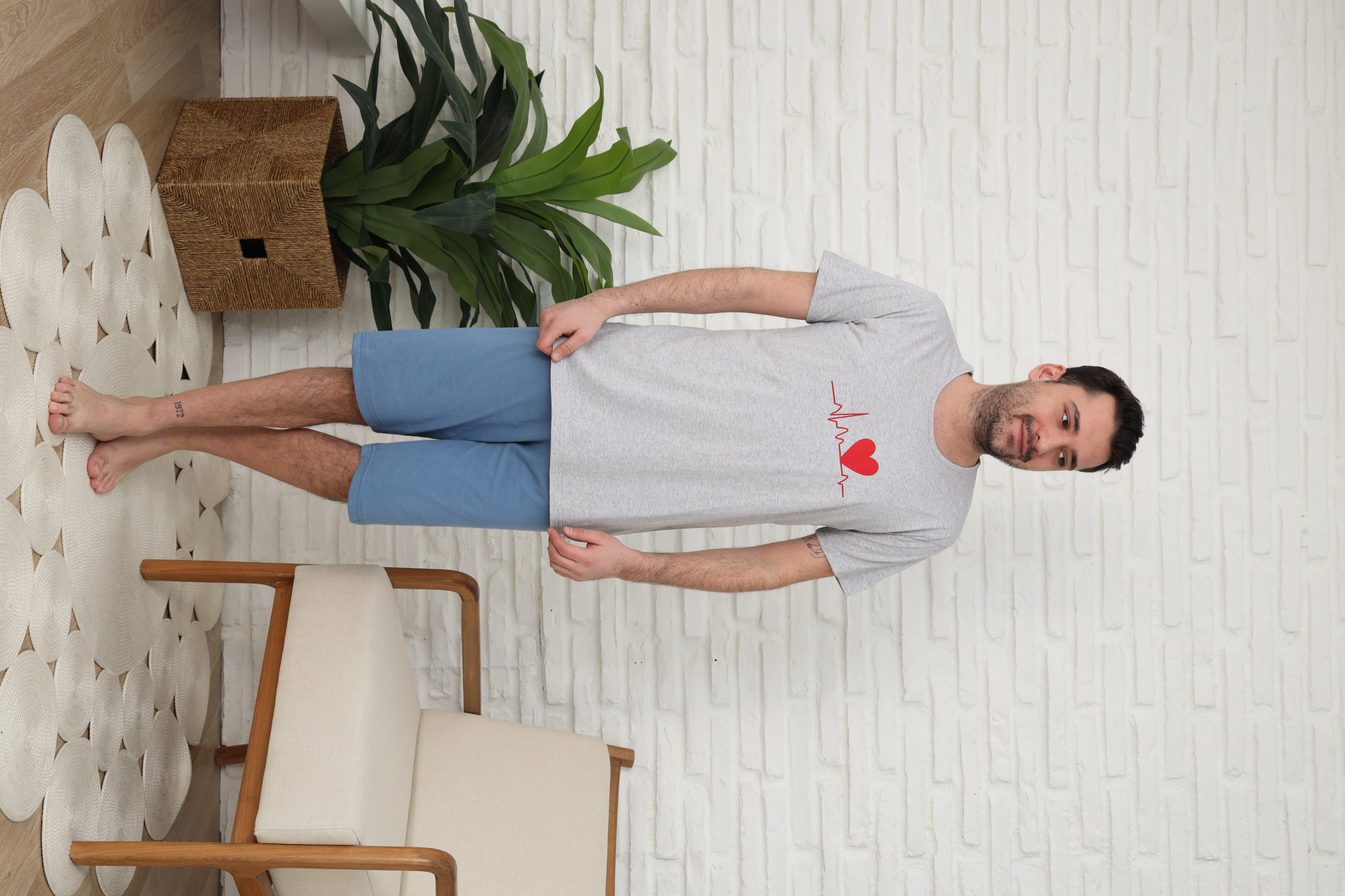 Bluză cu mânecă scurtă și pantaloni trei sferturi sunt ideali pentru zilele de vară sau momentele de relaxare acasă, iar imprimeul cu inimă adaugă un strop de căldură și stil. Pantalonii trei sferturi permit o mișcare liberă și confortabilă, iar designul modern face ca această pijama să fie o alegere perfectă pentru bărbații care vor să se simtă relaxați și încrezători. Ideală pentru momentele de odihnă, această pijama combină funcționalitatea cu un mesaj plin de emoție.