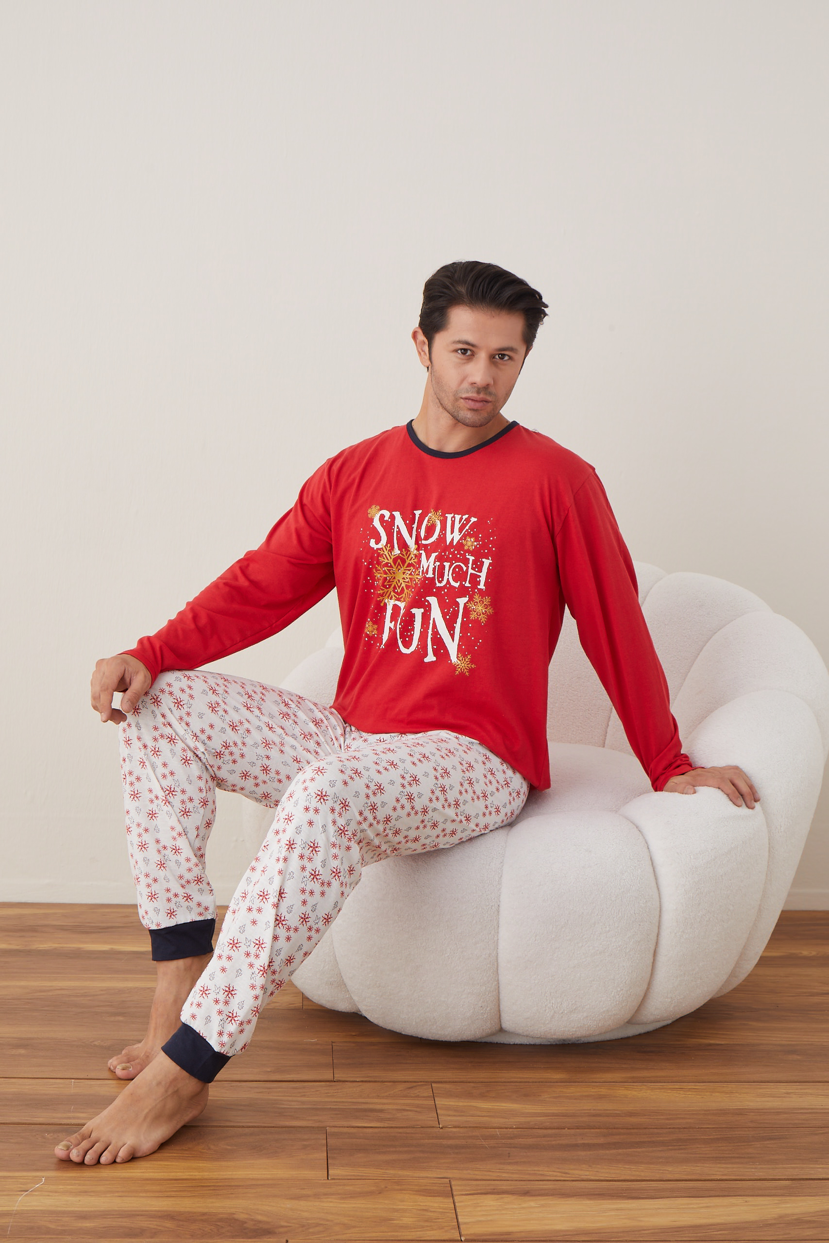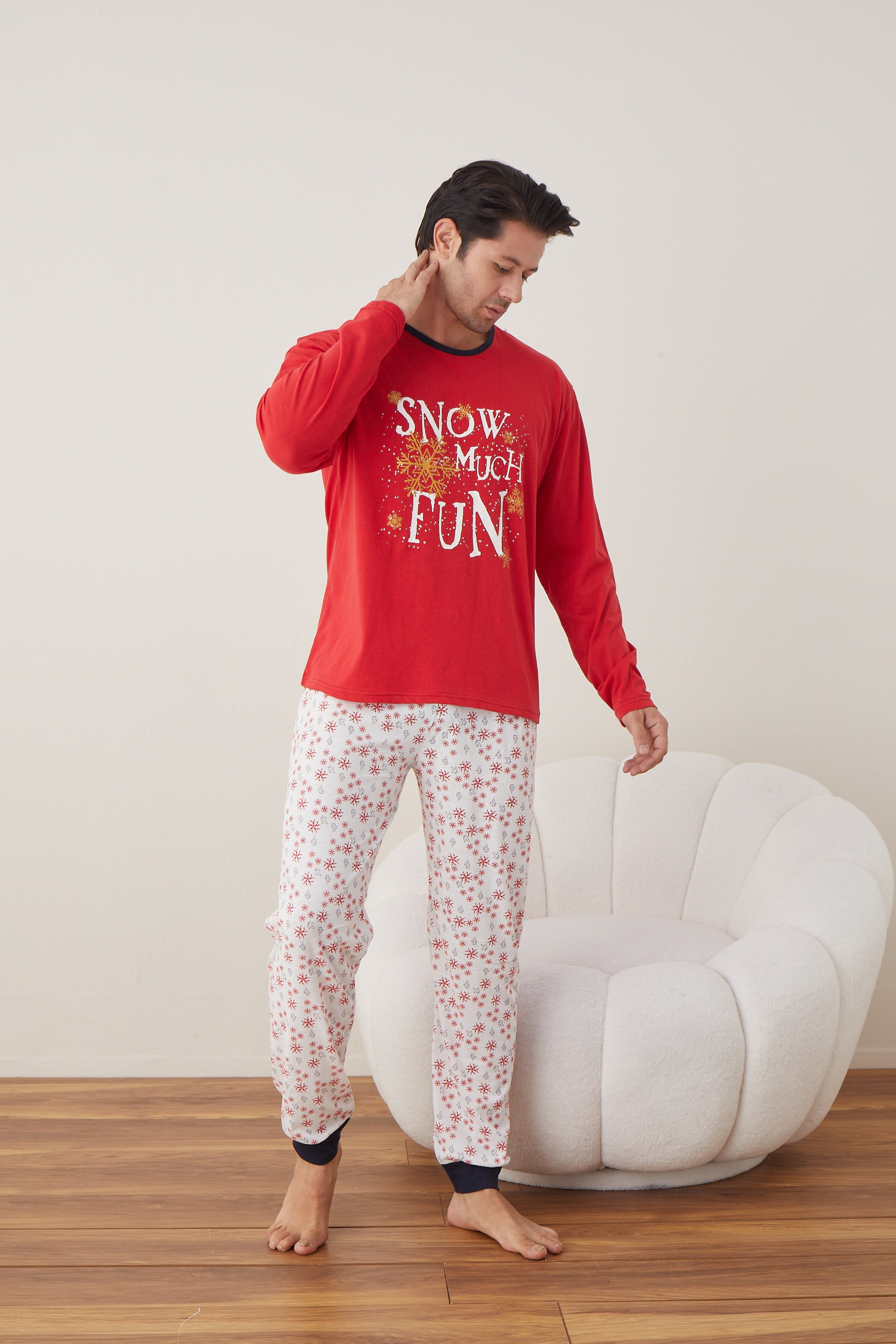 Bucură-te de serile de iarnă într-un mod relaxat și distractiv cu aceste pijamale de Crăciun pentru bărbați, cu imprimeu „Snow Much Fun”! Realizate dintr-o combinație ideală de 75% bumbac și 25% poliester, sunt moi la atingere, călduroase și perfecte pentru sezonul rece.