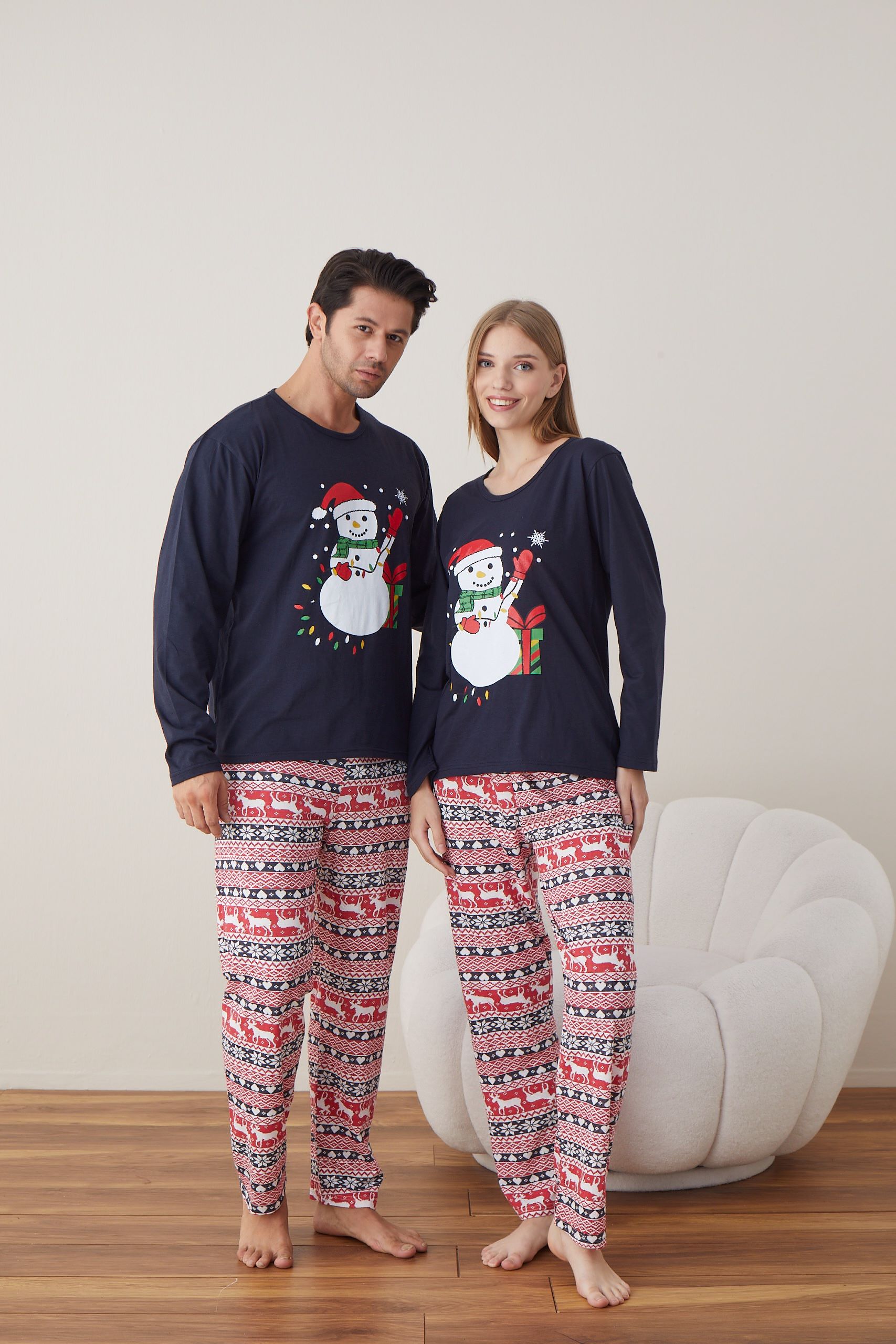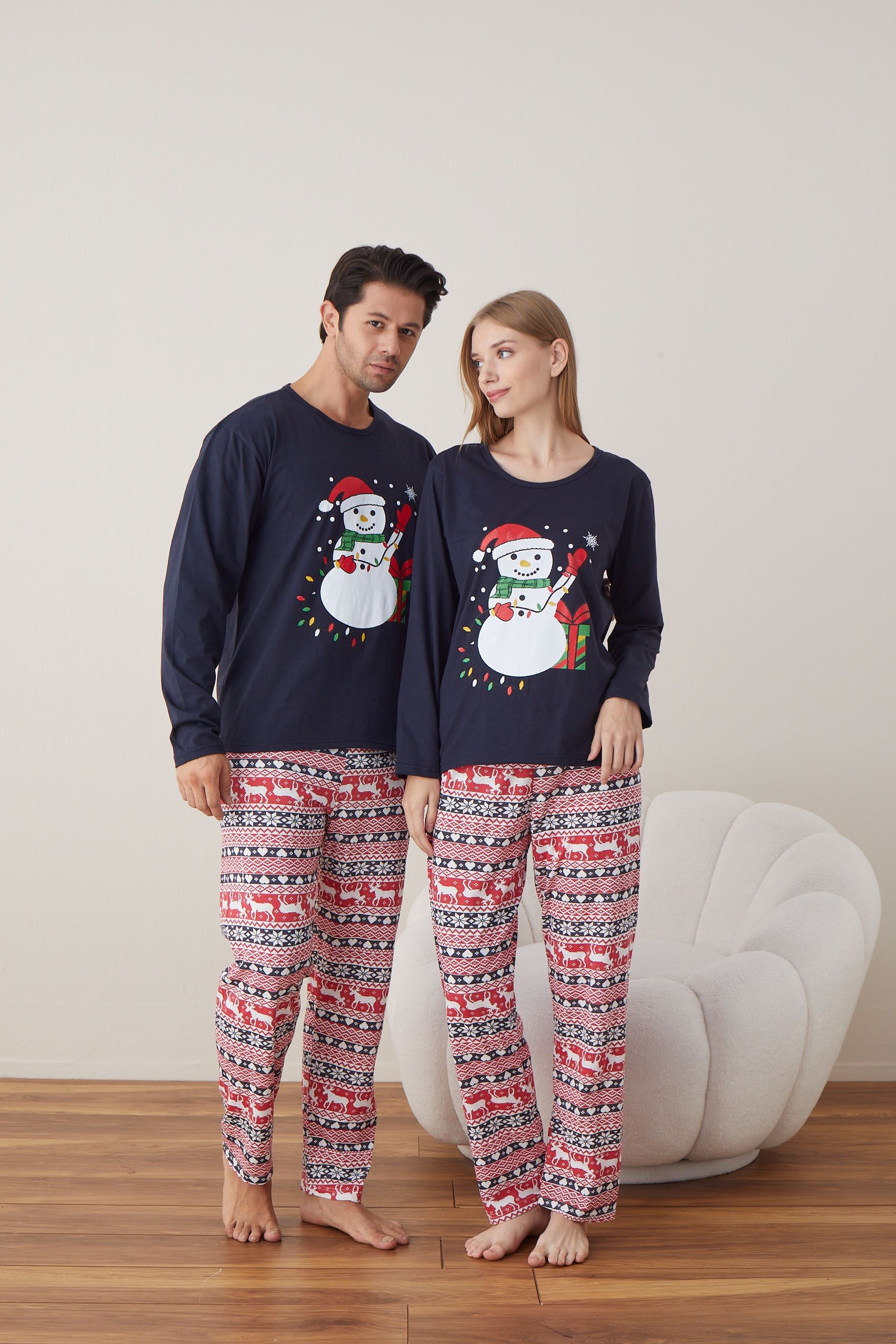 Petreceți sărbătorile în doi cu stil și zâmbet! Aceste pijamale de Crăciun pentru cuplu combină o bluză bleumarin cu imprimeu simpatic cu om de zăpadă și pantaloni decorați cu reni – un duo perfect pentru seri cozy, poze de sărbători și dimineți festive.