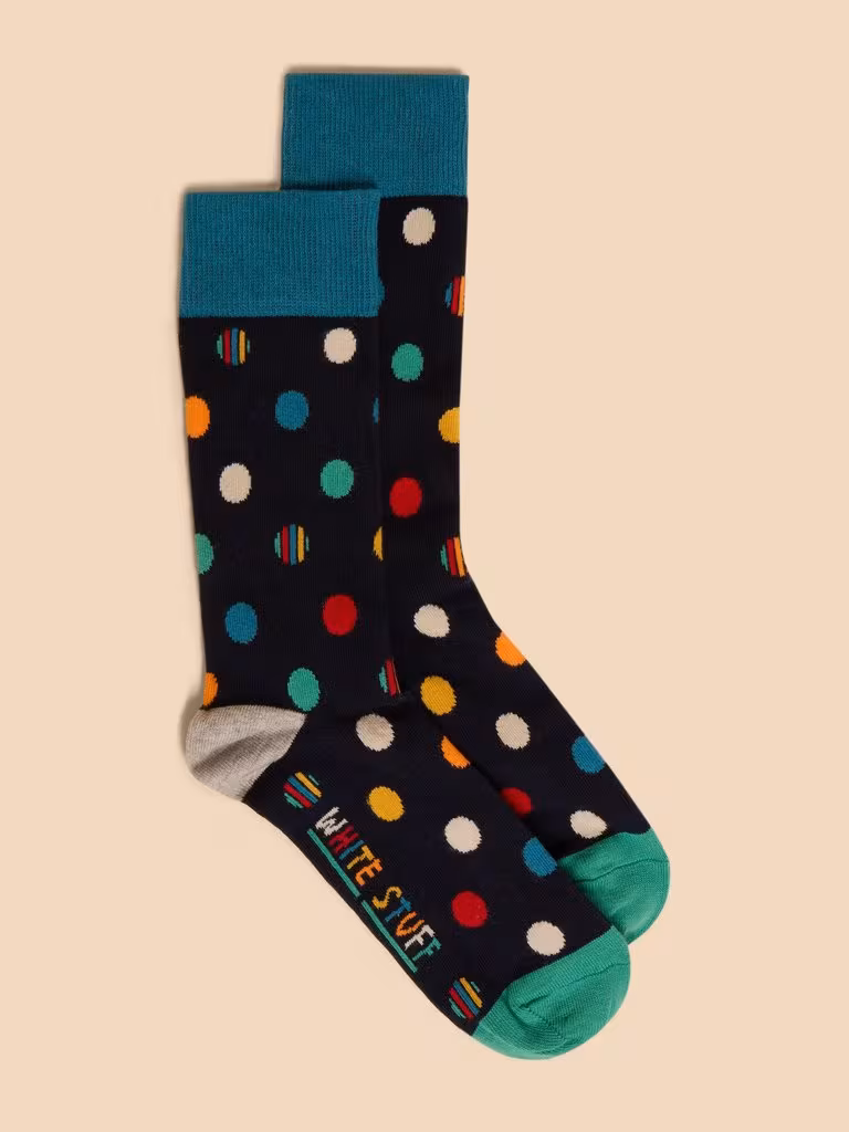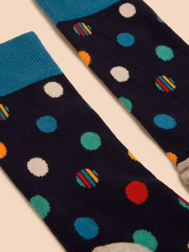 Șosete bărbați confecționate din bumbac organic de calitate superioară, fără cusături, pentru un confort sporit. Design modern cu buline pe fundal bleumarin – ideale pentru un look elegant și relaxat.