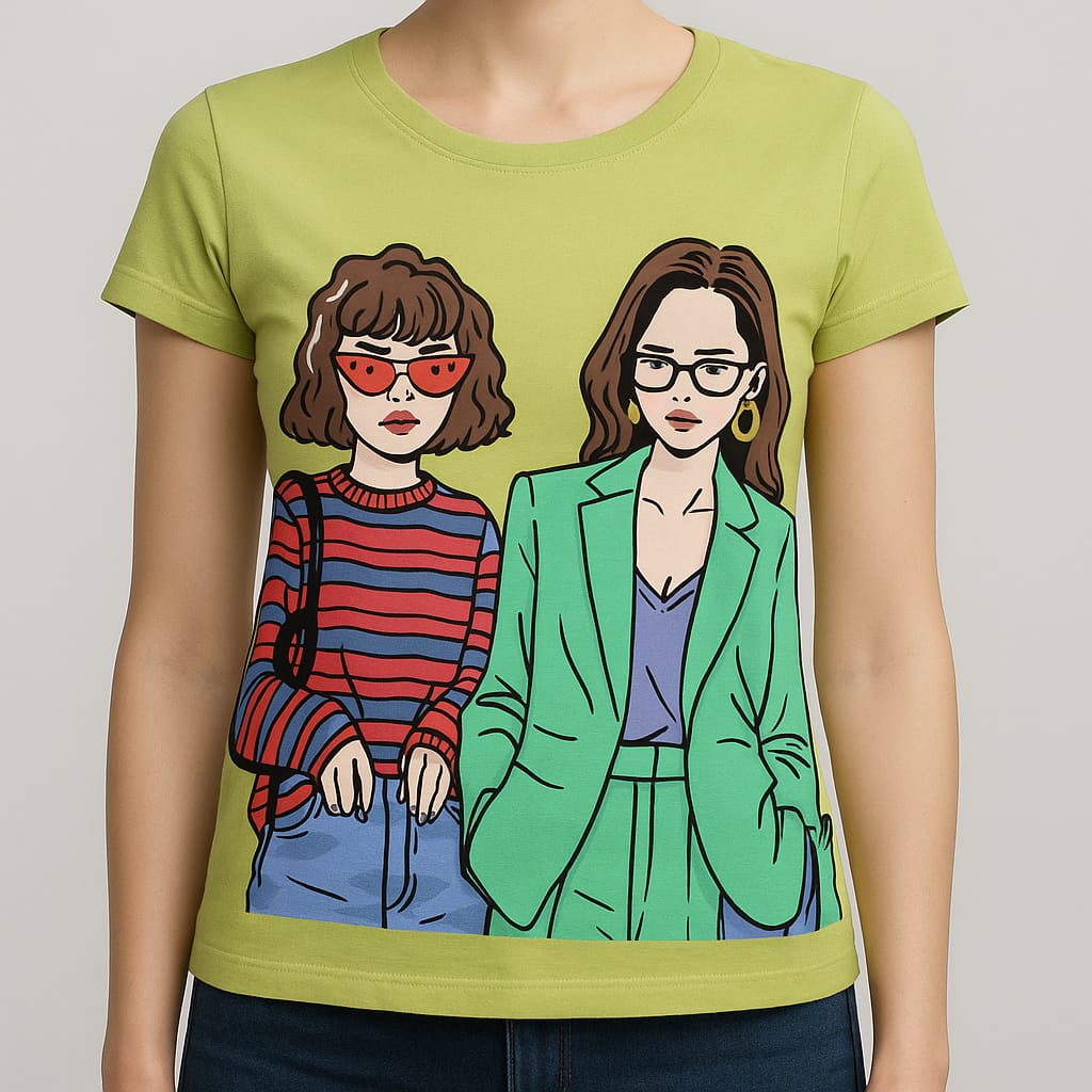 Designul se remarcă prin imprimeul frontal colorat, reprezentând două femei stilizate în tonuri vii – una purtând o bluză în dungi roșii și ochelari roșii în formă de inimă, cealaltă într-un costum verde mentă și bluză mov. Fundalul tricoului este de un verde deschis/lămâie, adăugând o notă veselă și modernă.